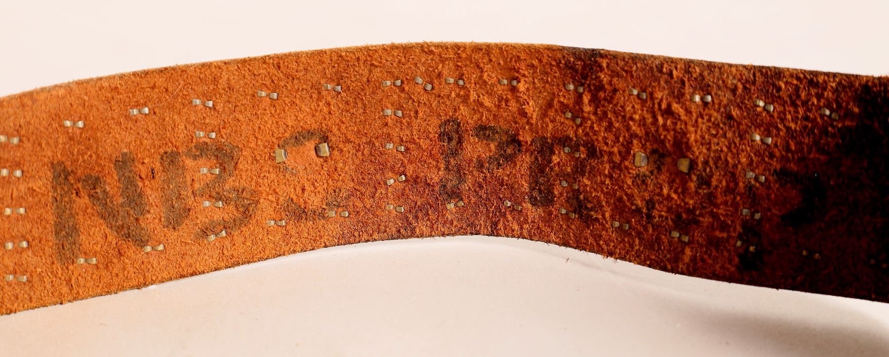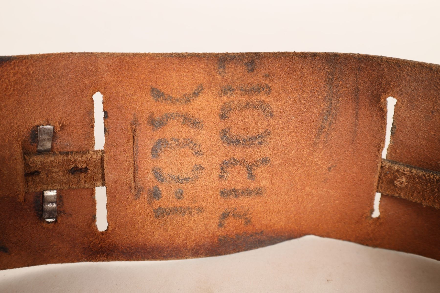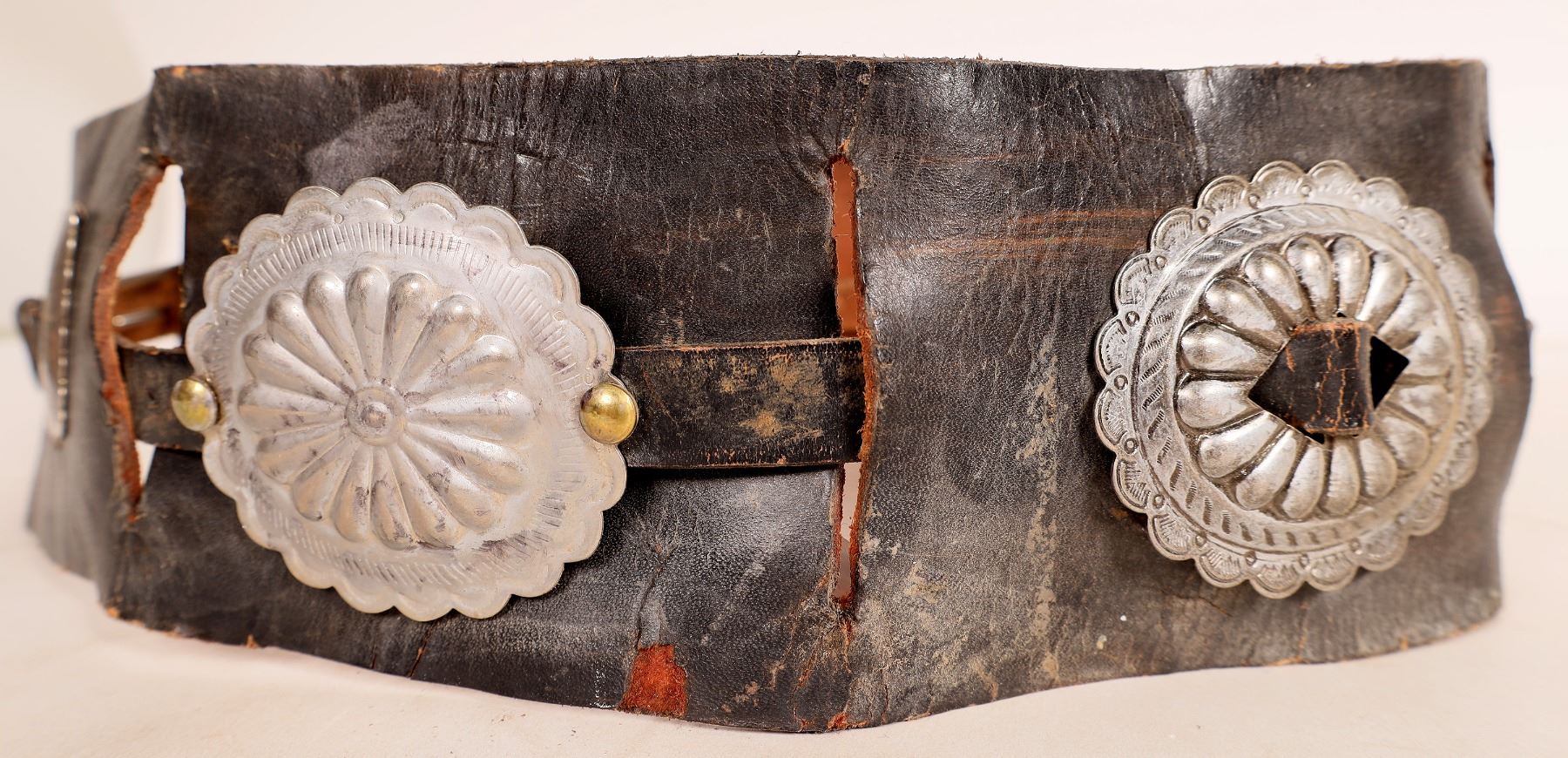 2 Hollywood props leather belts. Studded belt with points and some jewels removed, 28", stamped NBC prop on back. Size 34 black leather with 7 conchos, stamped FOX PROP on back. [Hollywood] [California]