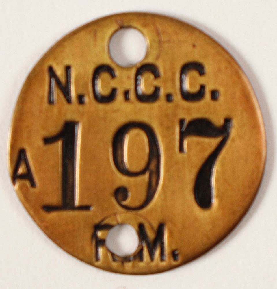 NCCC / RM brass tool check #A197. Round with hole at top. From Nevada Consolidated Copper Company at McGill, NV, that operated 1904 to 1942. Tag dates from period 1920 to 1930. Date: Location: Nevada HWAC# 571907