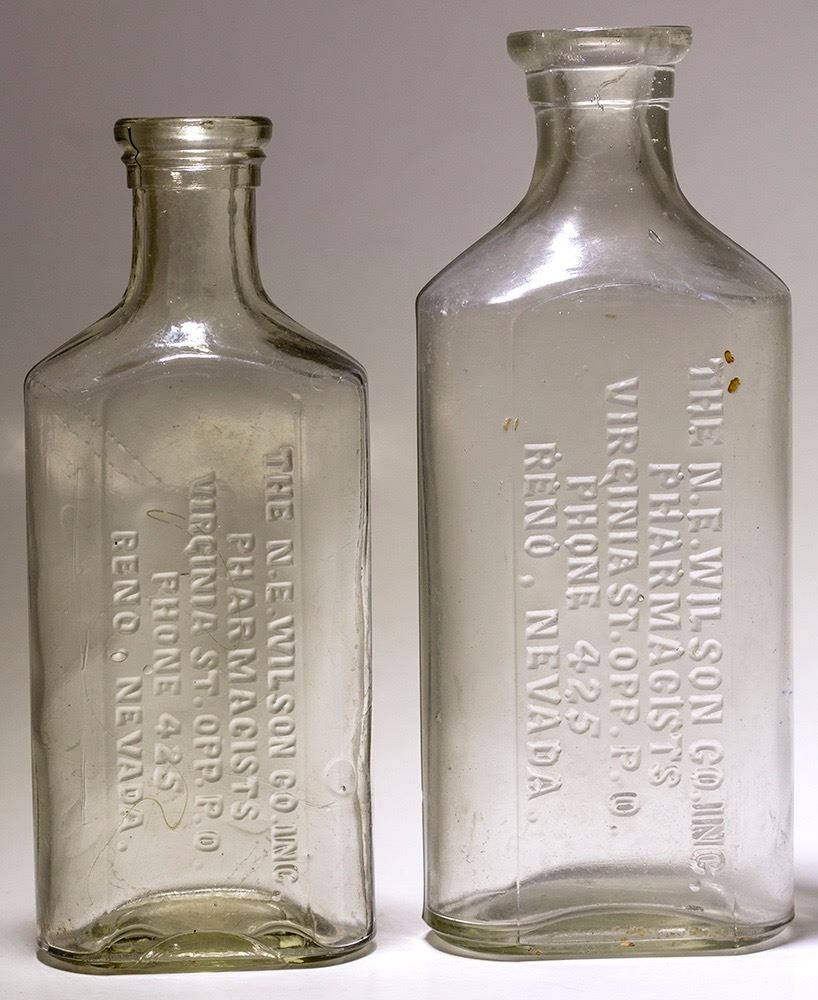 2 clear medicine. 5.5" and 6.5" Oval THE N. E. WILSON CO. INC. / PHARMACISTS / VIRGINIA ST / OPP. P.O. / PHONE 425 / RENO, NEVADA. Holabird page 402, book examples.No visible chips or cracks. Date: c. 1916+ Location: Reno, Nevada HWAC# 57937