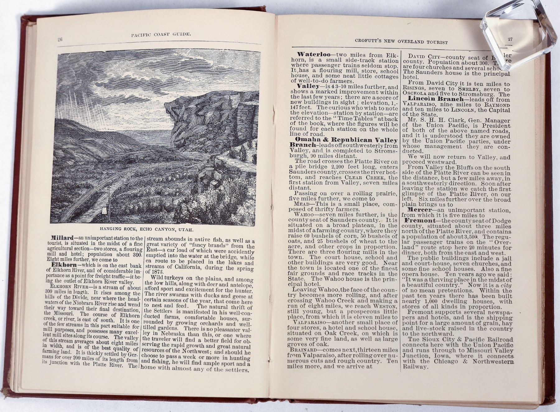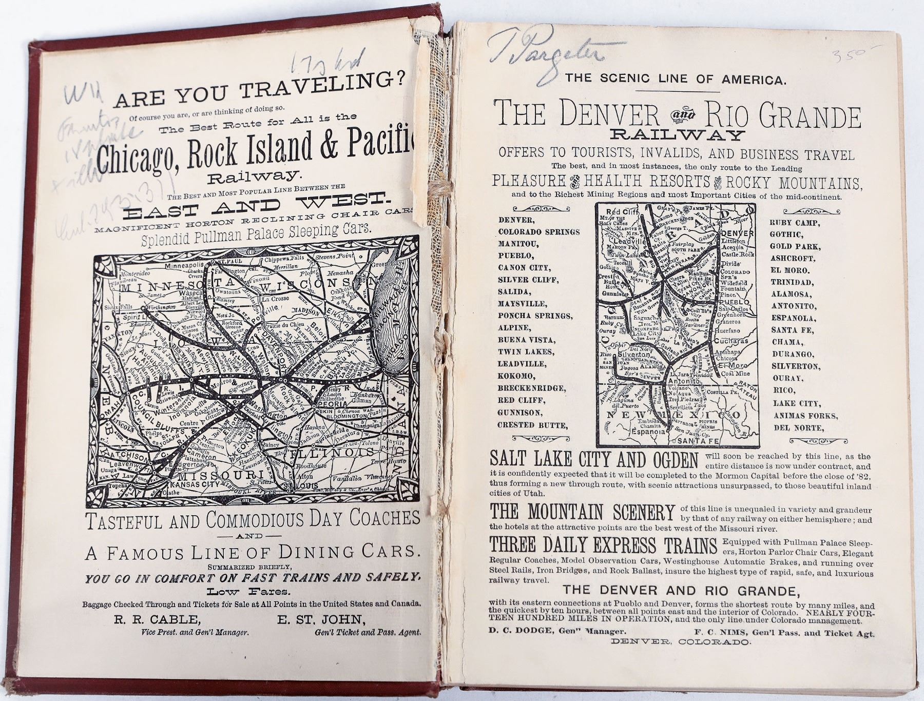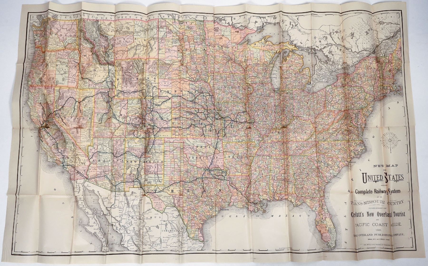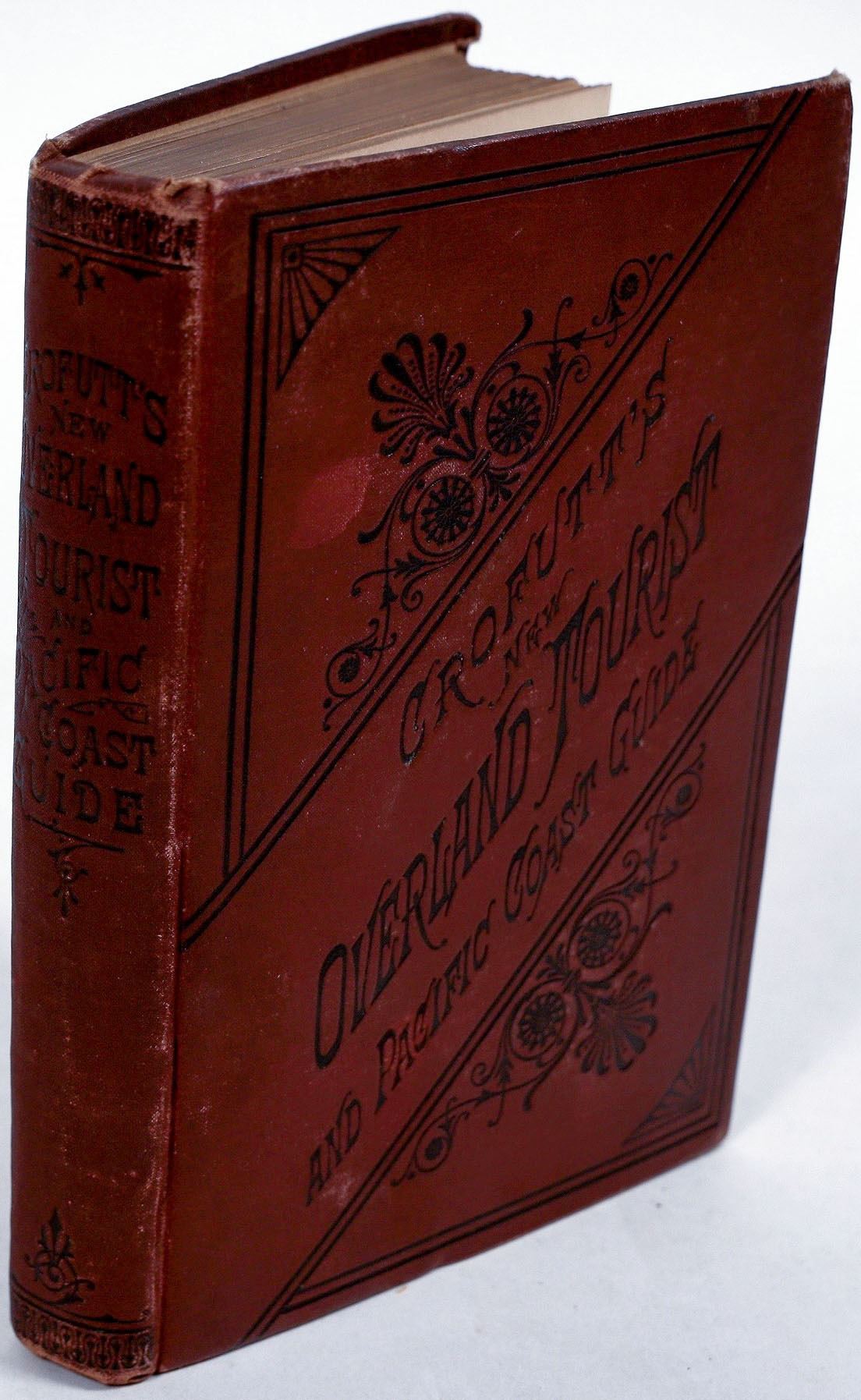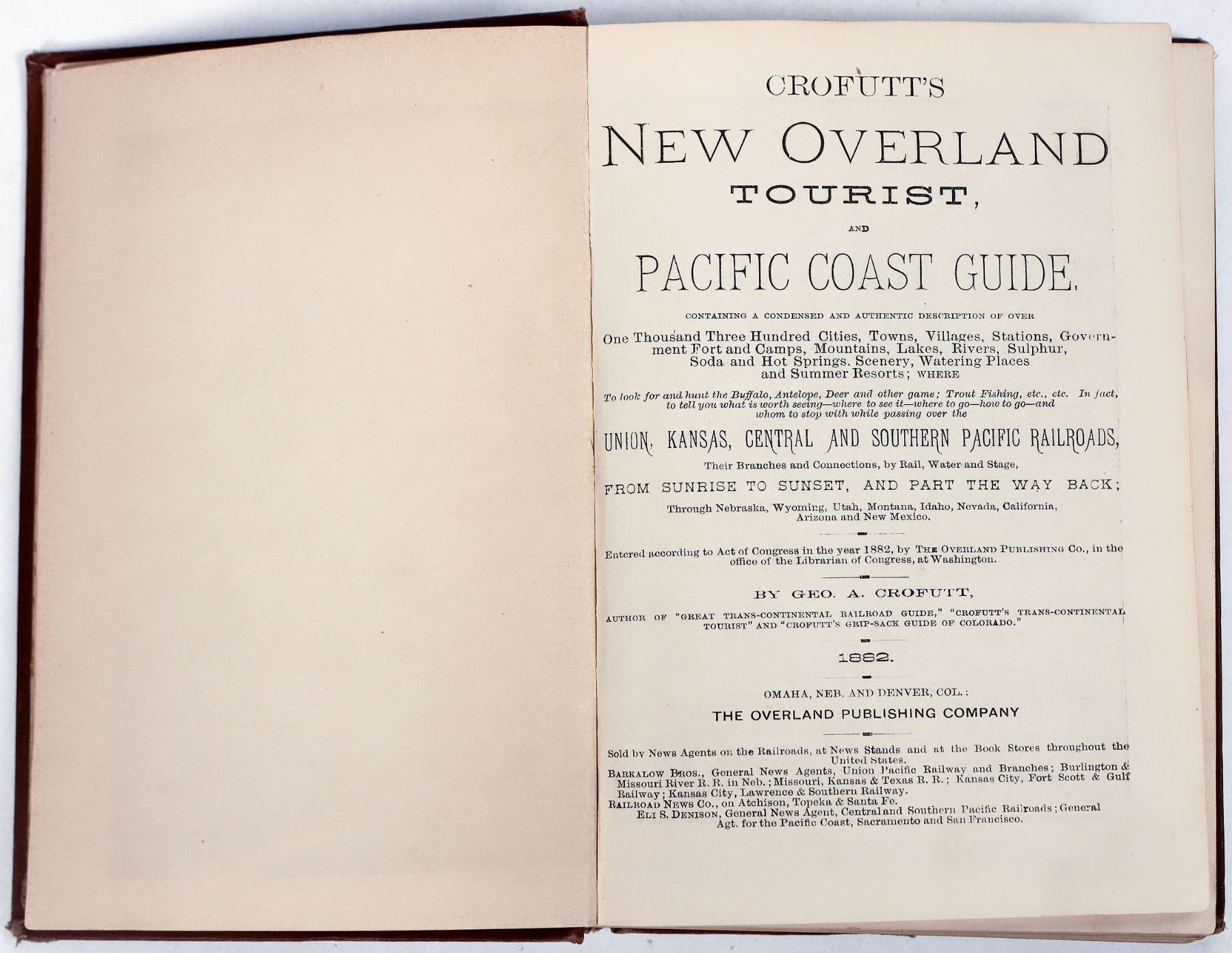"Crofutt's New Overland Tourist, and Pacific Coast Guide," a hardback book about traveling on the "Union, Kansas, Central and Southern Pacific Railroads, their branches and connections, by rail, water and stage." Geo. A. Croft, copyright 1882, first edition, The Overland Publishing Co., Omaha, Nebraska and Denver, Colo. 275 pp., illustrated with several fold-out illustrations, large map of the complete railway system of the Trans-Missouri Country by Rand, McNally & Co., printers and engravers, Chicago. RARE to find it with the map. Front and rear board detaching, upper & lower corner wear, penciled writing inside cover & flyleaf page, lower inside tears front flyleaf and frontispiece pages.