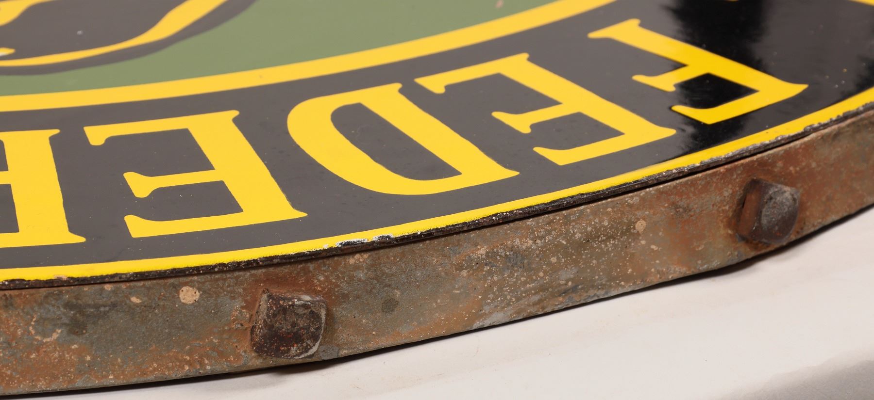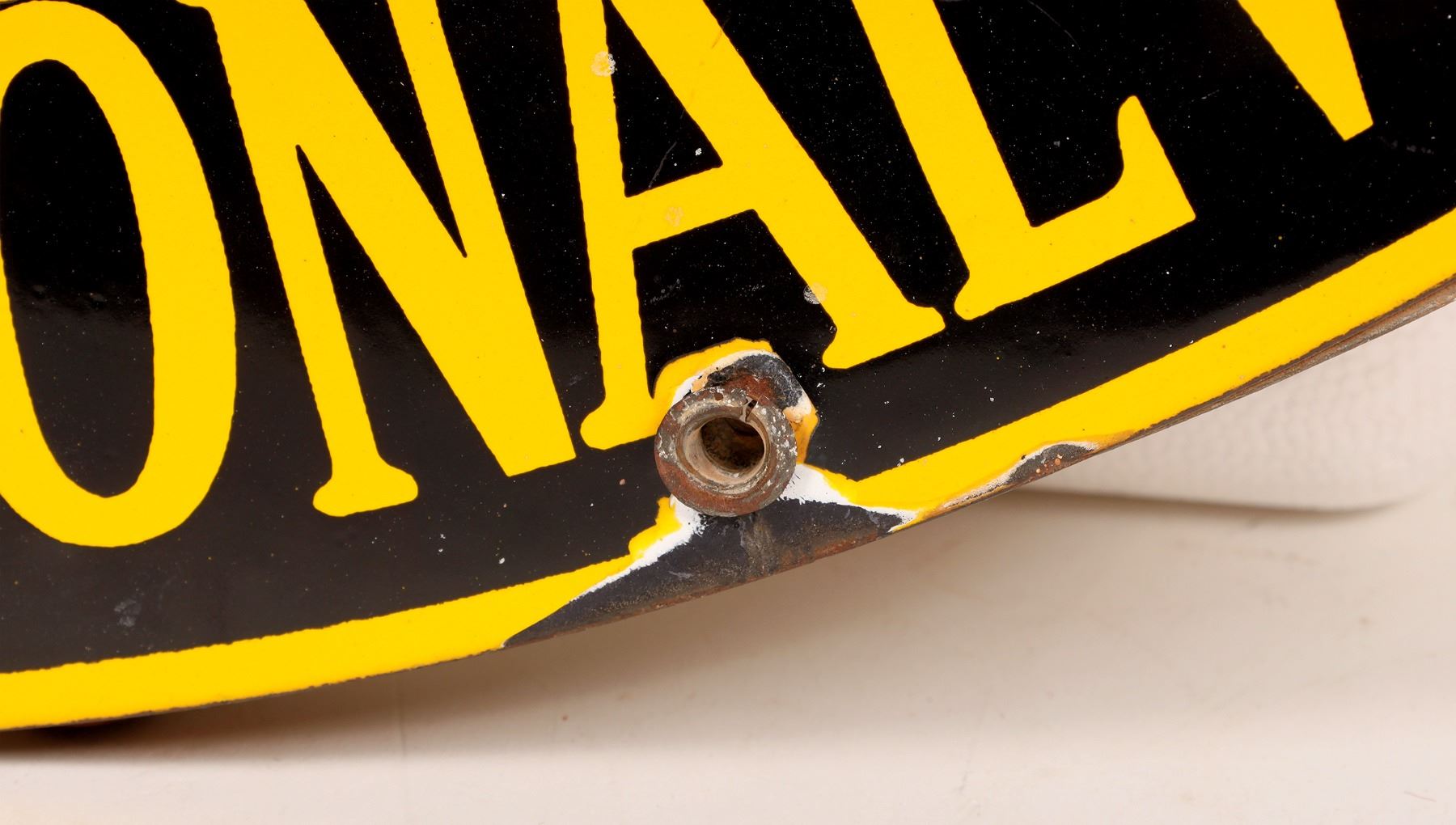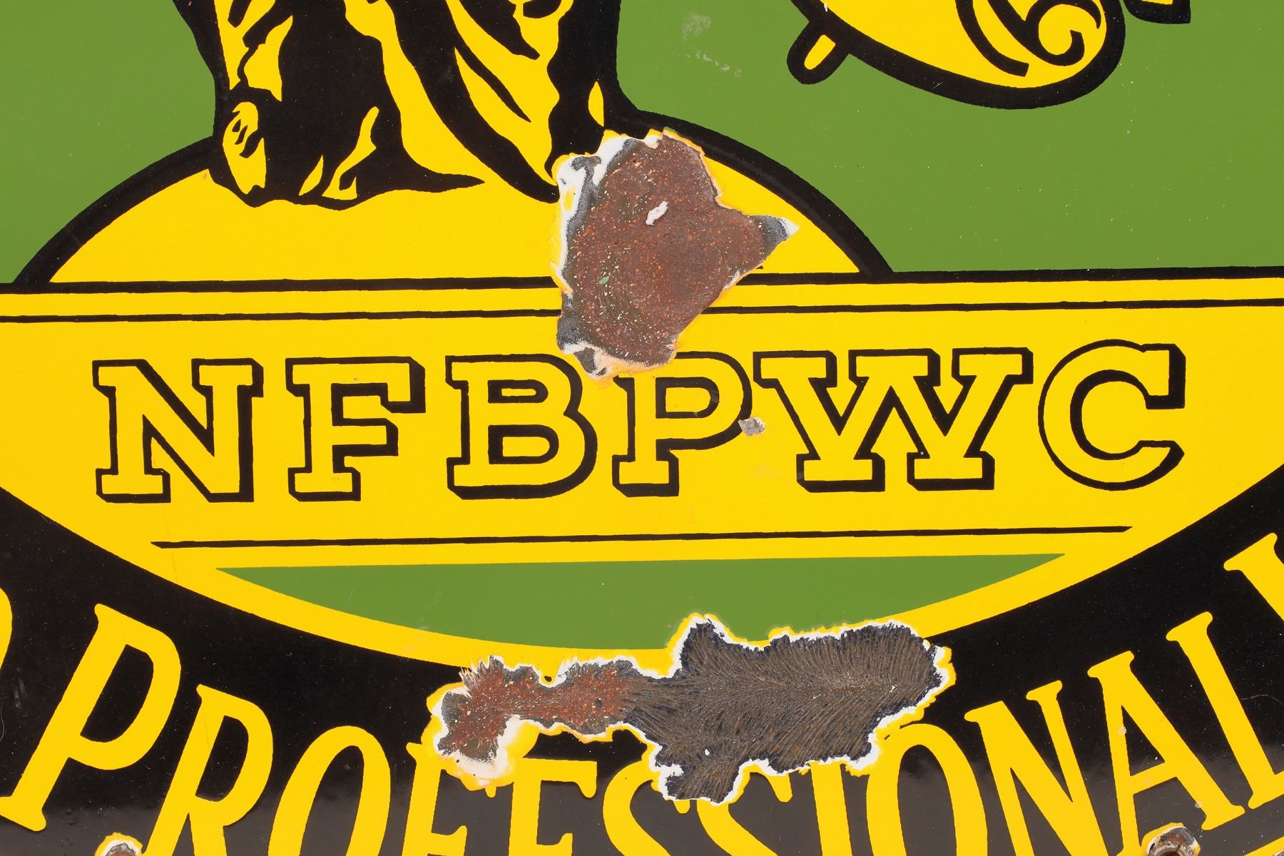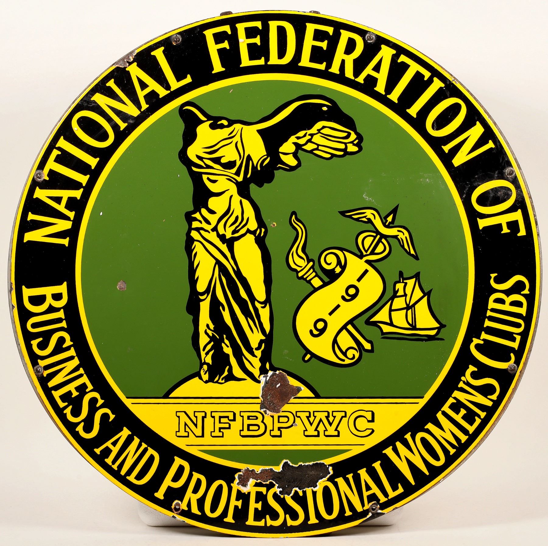 Single sided National Association of Business and Professional Women's Club 1919 sign. Founded in 1919 after World War I, an outgrowth of the activities of the Women's War Council originated by the War Department to coordinate women's contributions to the past war effort. 30", 8 screw holes, attached to metal hoop. 18 lbs., a few rust spots.