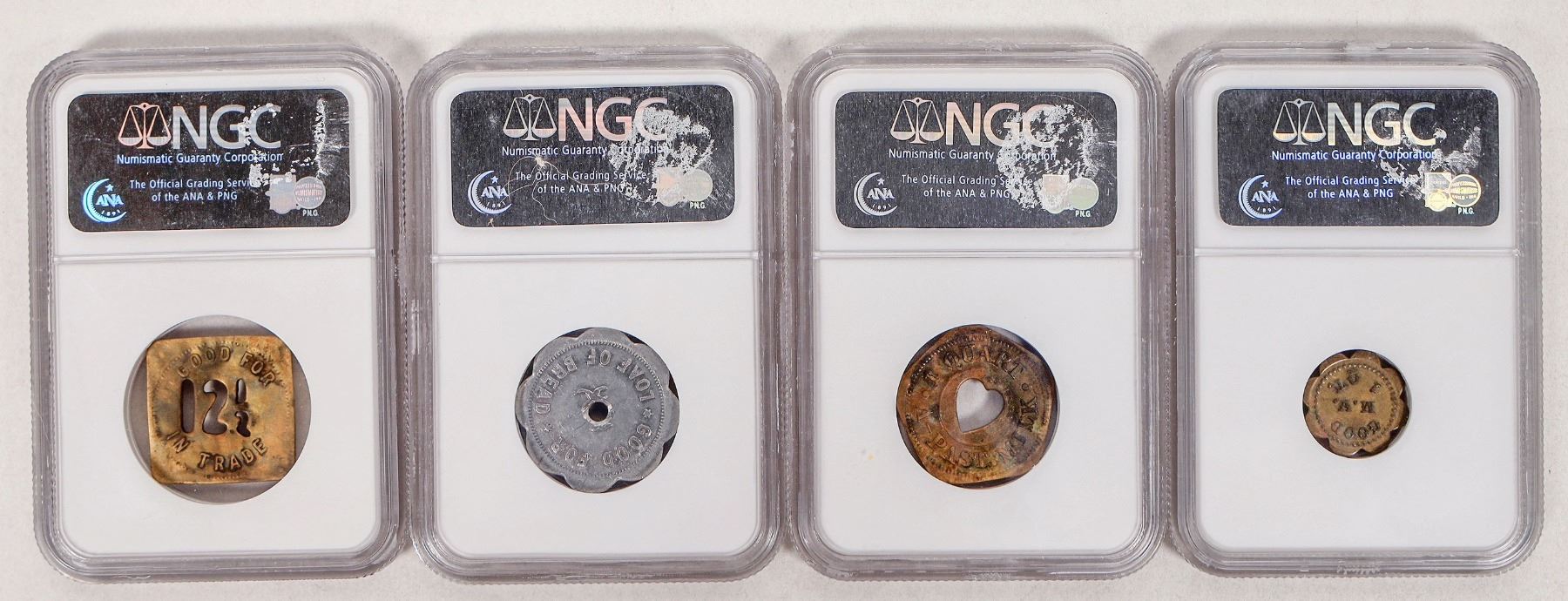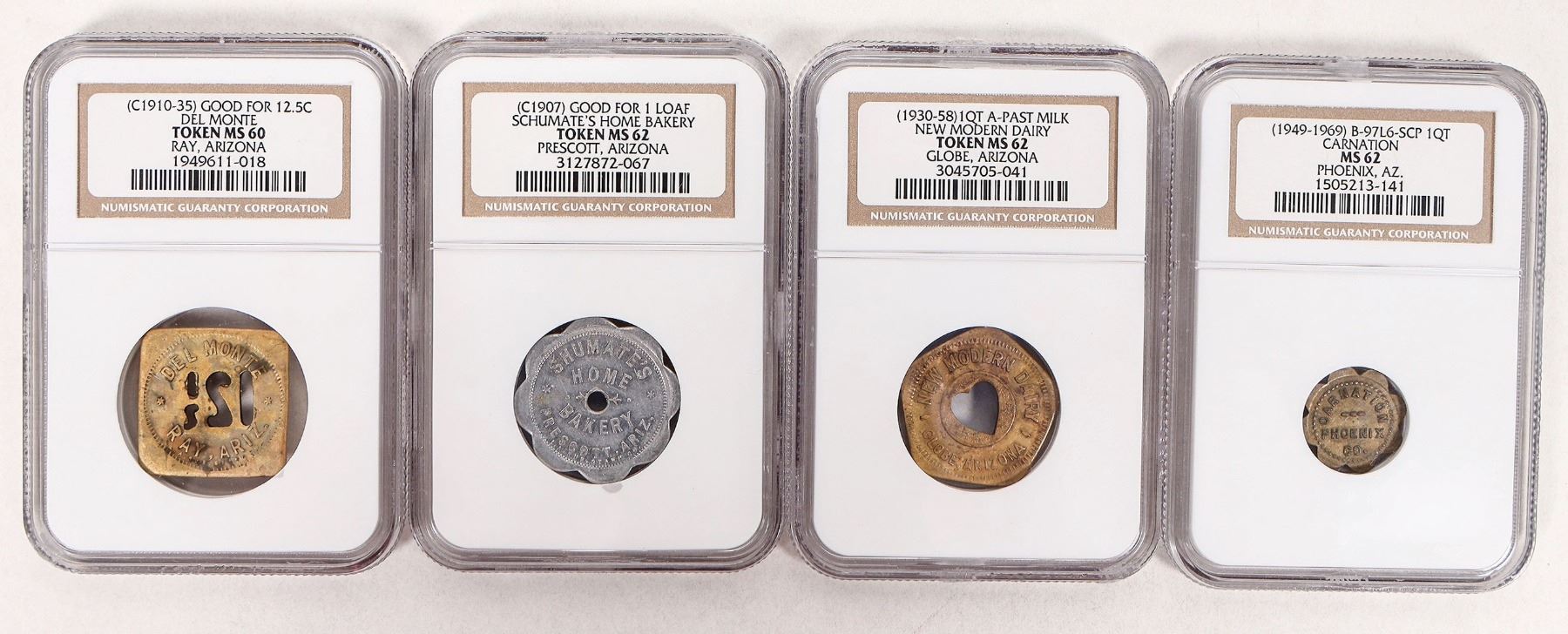 Lot of four different Arizona tokens: 1) NGC MS 62: Carnation, Phoenix; GF 1 Qt.; 2) NGC MS 62: New Modern Dairy, Globe, GF 1 Qt. A-Past milk; 3) NGC MS 62: Schumate's Home Bakery, Prescott, GF 1 loaf; 4) NGC MS 60: Del Monte, Ray, GF 12 1/2 cents.