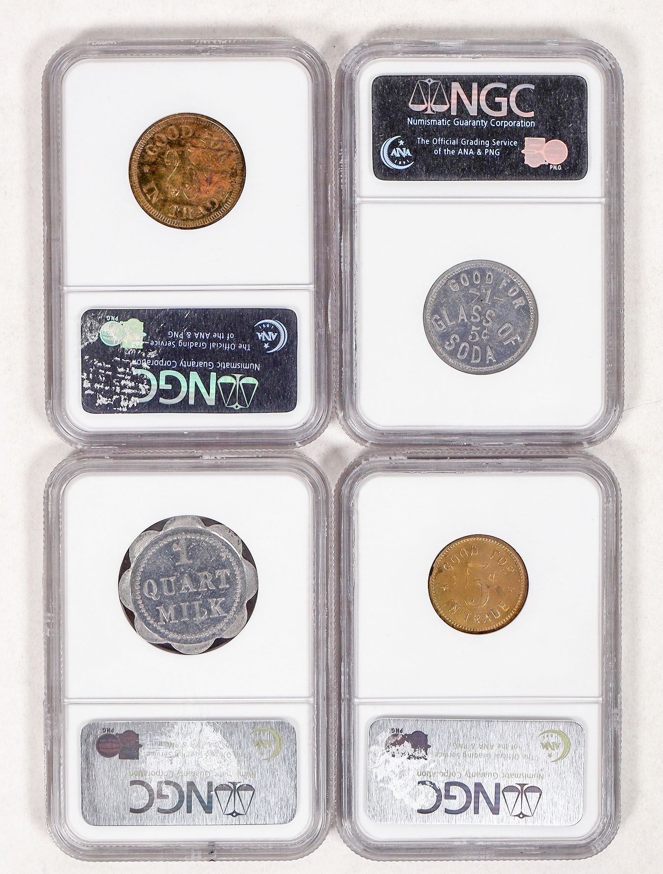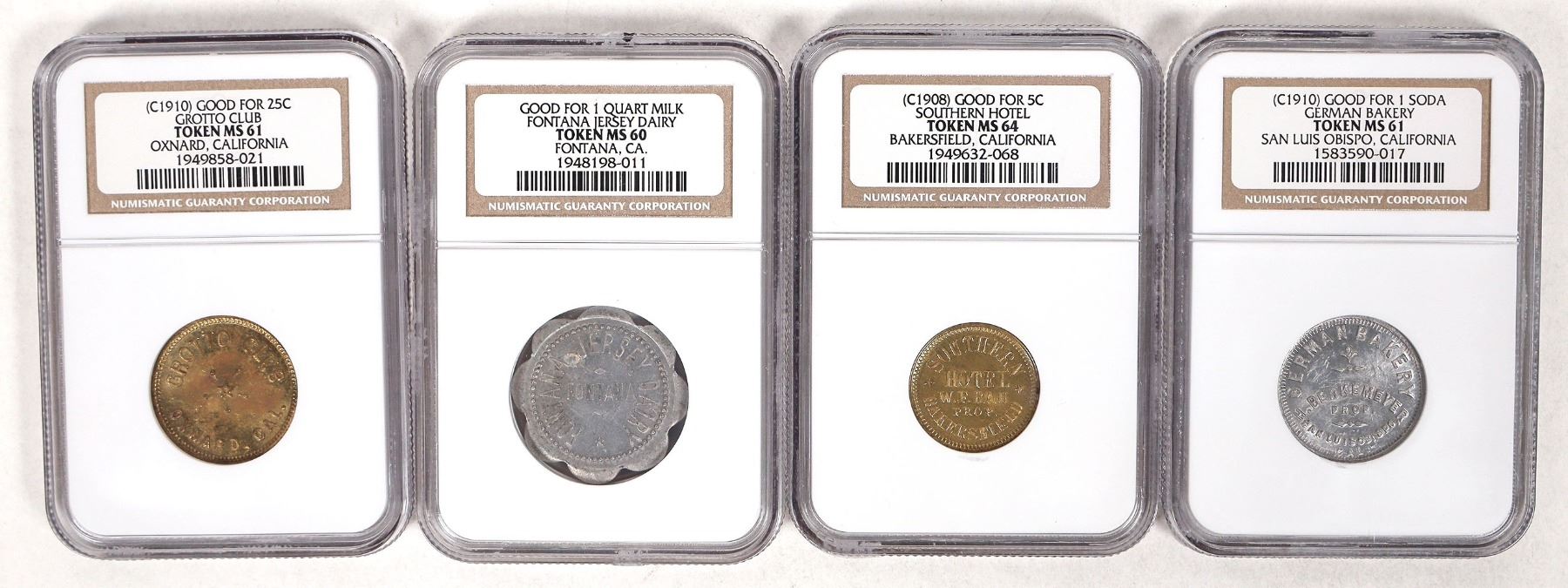 Four uncirculated tokens graded by NGC: 1) NGC MS 64: Southern Hotel, Bakersfield, GF 5c; 2) NGC MS 61: Grotto Club, Oxnard, GF 25c; 3) NGC MS 61: German Bakery, San Luis Obispo, GF 1 glass of 5c soda; 4) NGC MS 60: Fontana Jersey Dairy, Fontana, GF 1 quart milk.