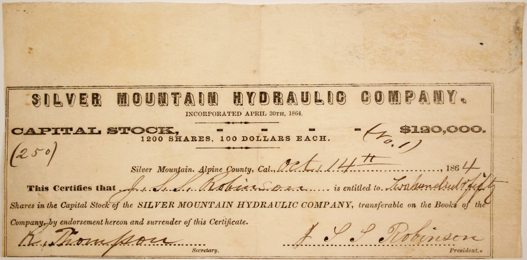 # 1 for 250 shares to JSS Robinson. Datelined Silver Mountain 1864. Signed by secretary R Thompson and president JSS Robinson. Small size - actual stock is 2.5 x 7". Incorporated April 30, 1864. Not Cancelled. A few pin holes on left side, otherwise in excellent condition. One vertical fold. Using all of our resources, we found no information on this mine. JSS Robinson was around for quite a bit in Silver Mountain City. He was an initial Trustee and incorporator for the Silver Mtn Hydraulic Co in October, 1863. He may have been staying in the Fisk Hotel in July, 1864, or at least was well acquainted with Charles Fisk; a case of goods was shipped from San Francisco for him, by Royal Fisk (letter 1864 July 9). In May, 1868, he bought the interest of William Pearson in the firm of Robinson & Pearson (1868 May 30 Chronicle). He was still living in Silver Mountain as of the 1870 Census; he was age 56; occupation "Miner"; born in Nova Scotia; and owned $1300 of real property and $300 of personal property; his wife's name was Augusta D., and she was born in Maine. In 1873, he sold his mill site (south of the town) with 40 acres “and the old Toll House” (Alpine Book “D” p. 510). Thompson was born September 20, 1822 in Montville, Maine. At 6'4" tall he was a tall California Pioneer, He settled on Whit's Bar on the Mokelumne, with a house on Prospect Hill, and won two terms as a justice of the peace (without being a lawyer originally) and so was known as "Judge" Thompson moved his family moved to Alpine County in June, 1864 and his investments included an interest in the Blue Goose mine.He also had an vestment in "a quarry which provided stone for building the town jail". He built a house; practiced law; served as a notary; and acted as secretary for several mining companies. Thompson commented that none other than Snowshoe Thompson gave him snowshoeing (skiing) lessons. A unique looking stock certificate, singed by important residents of Silver Mountain, and number 1! [Thank you to Karen Dustman, local historian and author of the book "Silver Mountain City (Clairitage Press) for background information on the mine and signatures.] Prag Collection City: Silver Mountain, Alpine County State: California Date: 1864 HWAC# 79728
