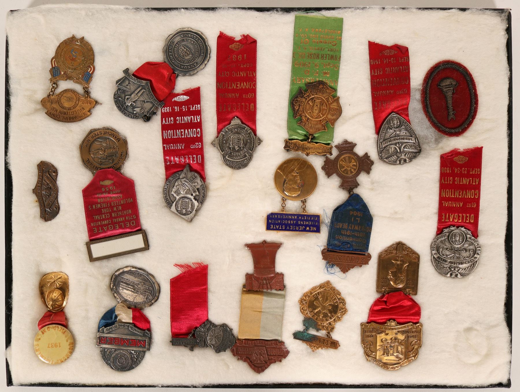 18 ribbons and medals. 1932 Lancaster, PA. Unidentified brass. Philadelphia. 1909 Walton. 1925 Hudson, NY. 1937 Richmond. 1938 NJ. 1904 Rockaway Beach, NY. 1956 Manchester, NY. 1925 MN brass. 1938 Atlantic City, NJ. NJ. Red oval patch. 1940 Atlantic City, NJ. 1909 Middleton, NY. 1937 Atlantic City, NJ. 1939 Atlantic City, NJ. Watertown, NY