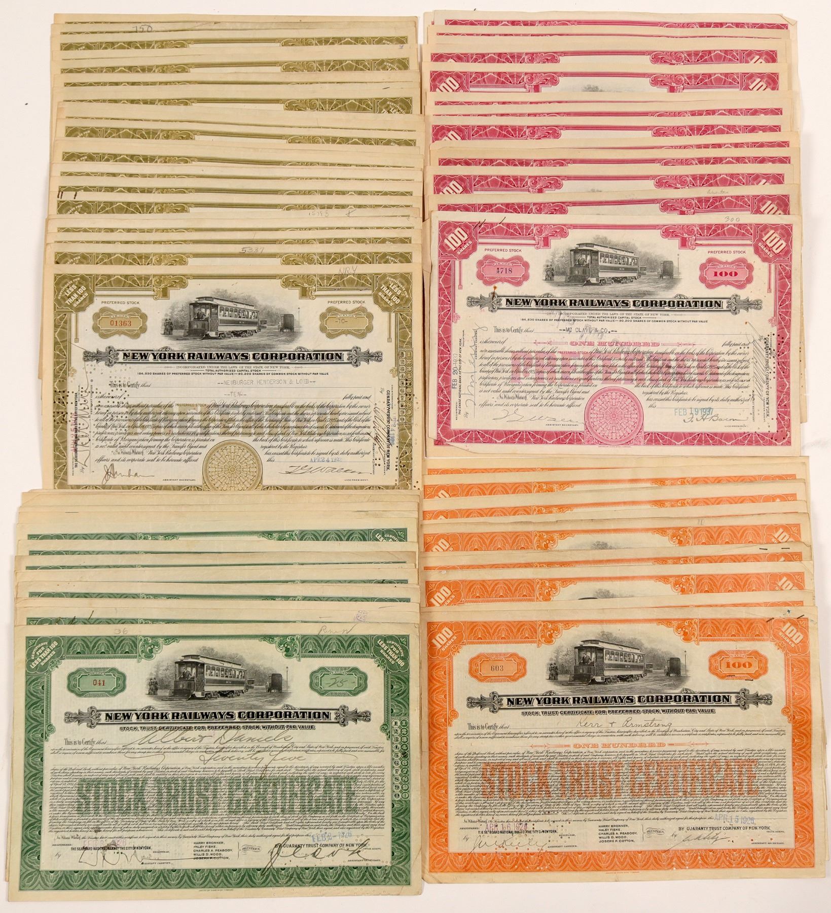 79 cancelled stock certificates for New York Railways Corp. 4 certificates with RN stamps on back. Colored seals on bottom center of stock certificates. Vignette of railway car on top center of certificate. Countersigned and registered. Signed by assistant secretary (or cashier) and vice-president. Printed: American Bank Note Co. New York Railways Corp. was a railway company that operated street railways in Manhattan, New York City, between 1925 and 1936. During 1935/1936 it converted its lines to bus routes which were operated by the New York City Omnibus Corp. Now operated by the Manhattan and Bronx Surface Transit Operating Authority, the successor to the New York Railways Co. which was in receivership. Some certificates stamped "surrender for cancellation."