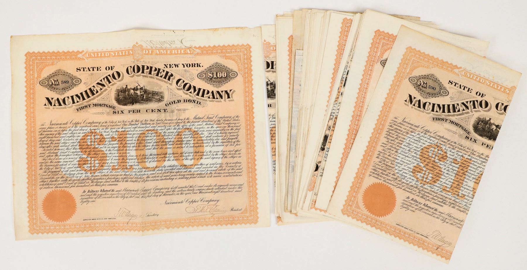 Lot of approx. (+50) Gold Bond certificates, issued by the "Nacimiento Copper Company." First Mortgage Gold Bond Six Per Cent is listed below the central Rail workers vignette. Embossed corporate seal in orange in lower left corner. These are signed, not issued or cancelled. Each folded sheet has a full set of attached coupons for $3 each, payable as they mature in succeeding years. Overall condition is very good to near-excellent, particularly give their age. A few are quarter-folded, please see photos.