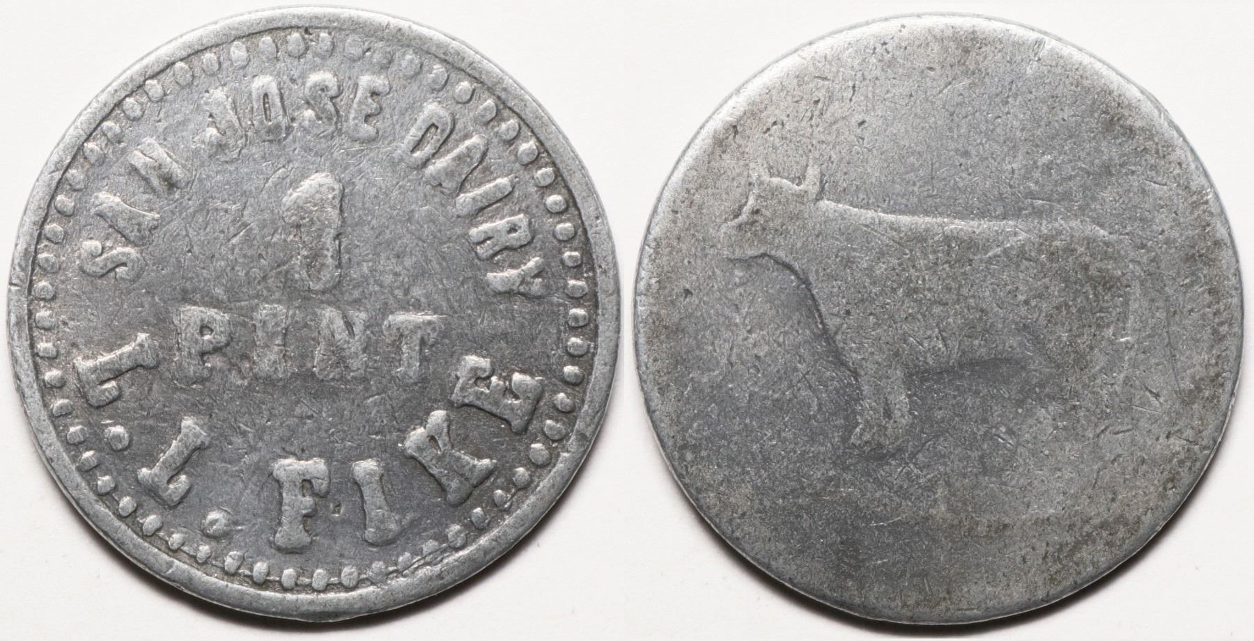 San Jose Dairy/ 1 / Pint/ L.L. Fike // (Pictorial image of cow). All weakly struck. R9. Size: 20mm. Round, Al.