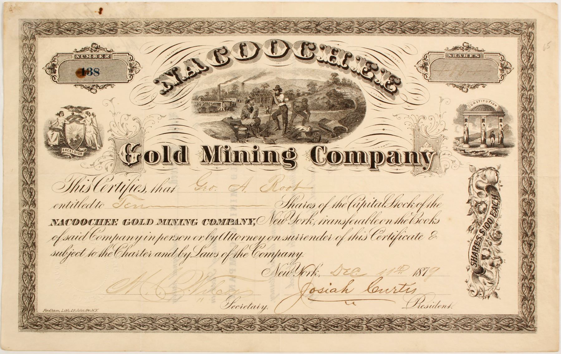 # 138 for 10 shares to George A Root. Signed by Wilcox and president Josiah Curtis. Dateline New York 1879. Miners on break vignette. Some foxing on top left. Very Nice Condition. Located near the gold discovery sites in Georgia. Dukes Creek (originally called Nacoochee Creek) is the creek in White County, Georgia, on which gold was found in 1828. Either Frank Logan or one of his slaves is typically given the credit for this find. The discovery of gold in White County and neighboring Lumpkin County led to the Georgia Gold Rush. Ken Prag Collection
