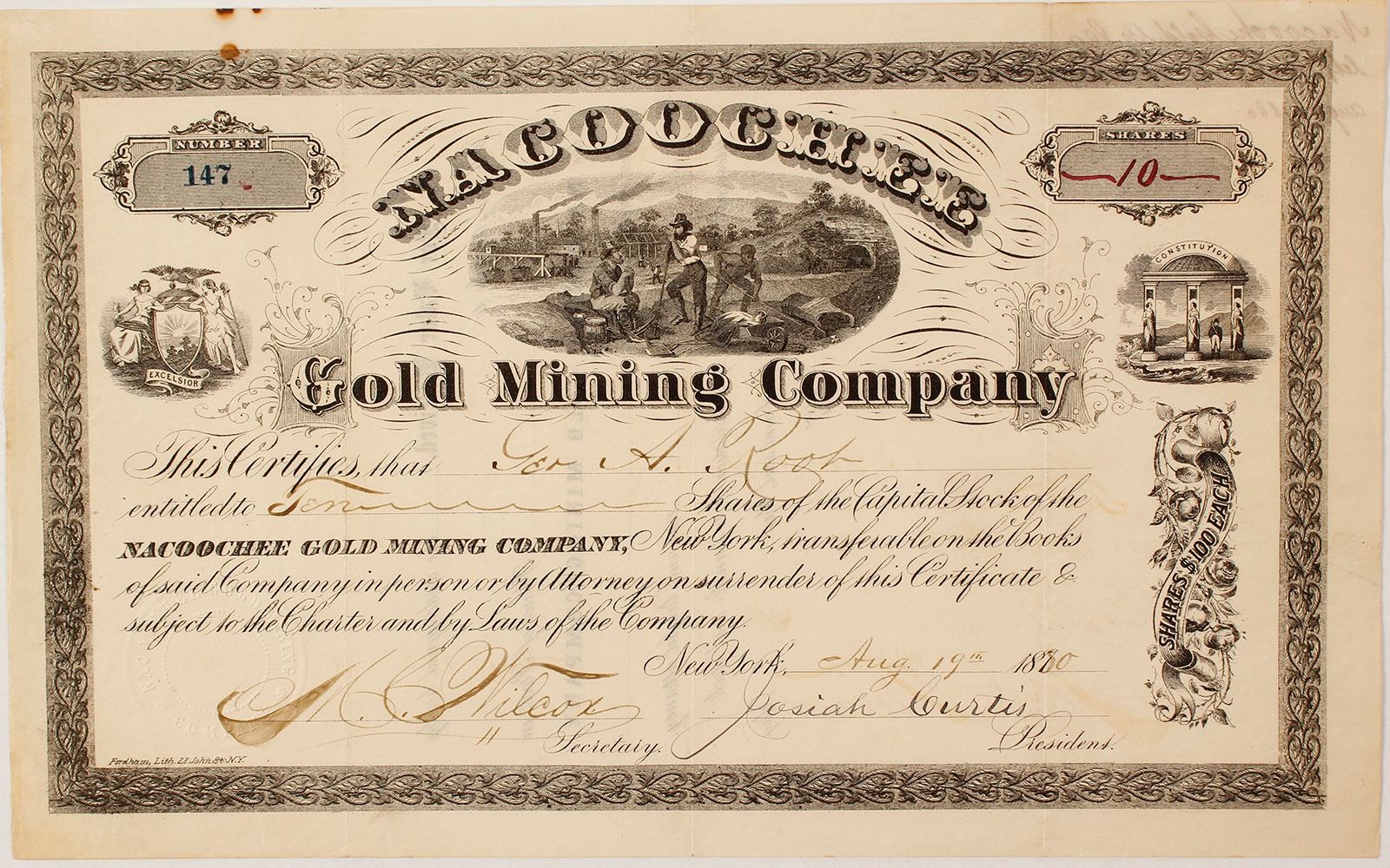 Number 147 for 10 shares issued to George A Root in 1880. Miners on break vignette. Signed by secretary Wilcox and president Josiah Curtis. Some foxing on top left. Heavy vertical fold on right. All-in-all very nice! Located near the gold discovery sites in Georgia. Dukes Creek (originally called Nacoochee Creek) is the creek in White County, Georgia, on which gold was found in 1828. Either Frank Logan or one of his slaves is typically given the credit for this find. The discovery of gold in White County and neighboring Lumpkin County led to the Georgia Gold Rush. (Al Adams Gold Rush Memorabilia Collection) Date: 1880 Location: Nacoochee, Georgia HWAC# 56947