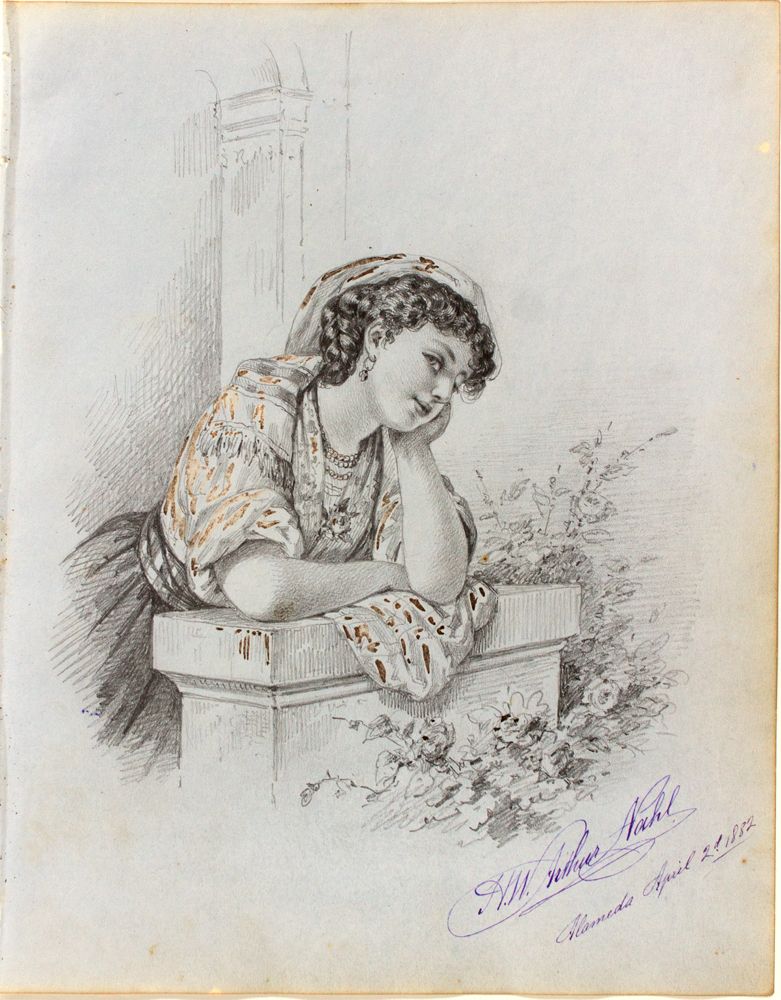 17. Hugo Wilhelm Arthur Nahl (1835-1890) was a pioneer in the settlement of California. Very detailed pencil drawing of young woman. Signature: H. W. Arthur Nahl. Alameda, April 2nd 1882. H. W. Arthur Nahl designed the California State seal that was painted by his brother Charles Nahl. Both brothers and their father had reproductions of their paintings in Art of the Gold Rush, published by the Oakland Museum of Art, Crocker Art Museum and the University of California Press.