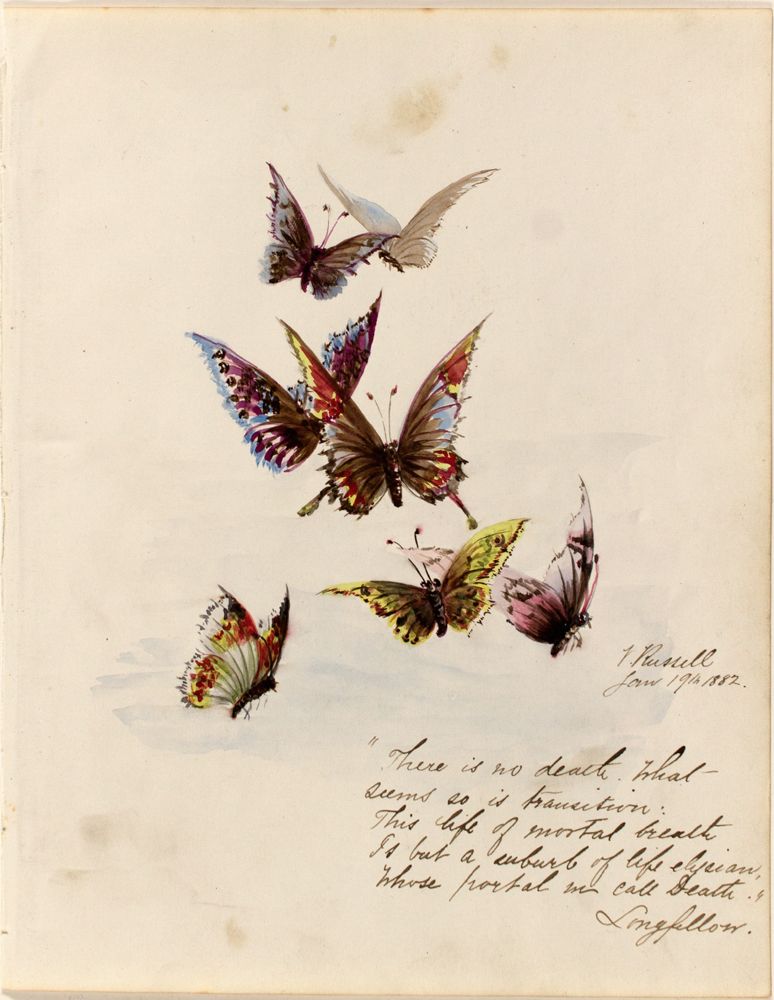 10. V. Russell’s delicate watercolor of butterflies, 1882. The poem on the drawing reads: “There is no death. What seems so is transition. This life of mortal breath is but a suburb of life elysian, whose portal we call Death.” Henry Longfellow.