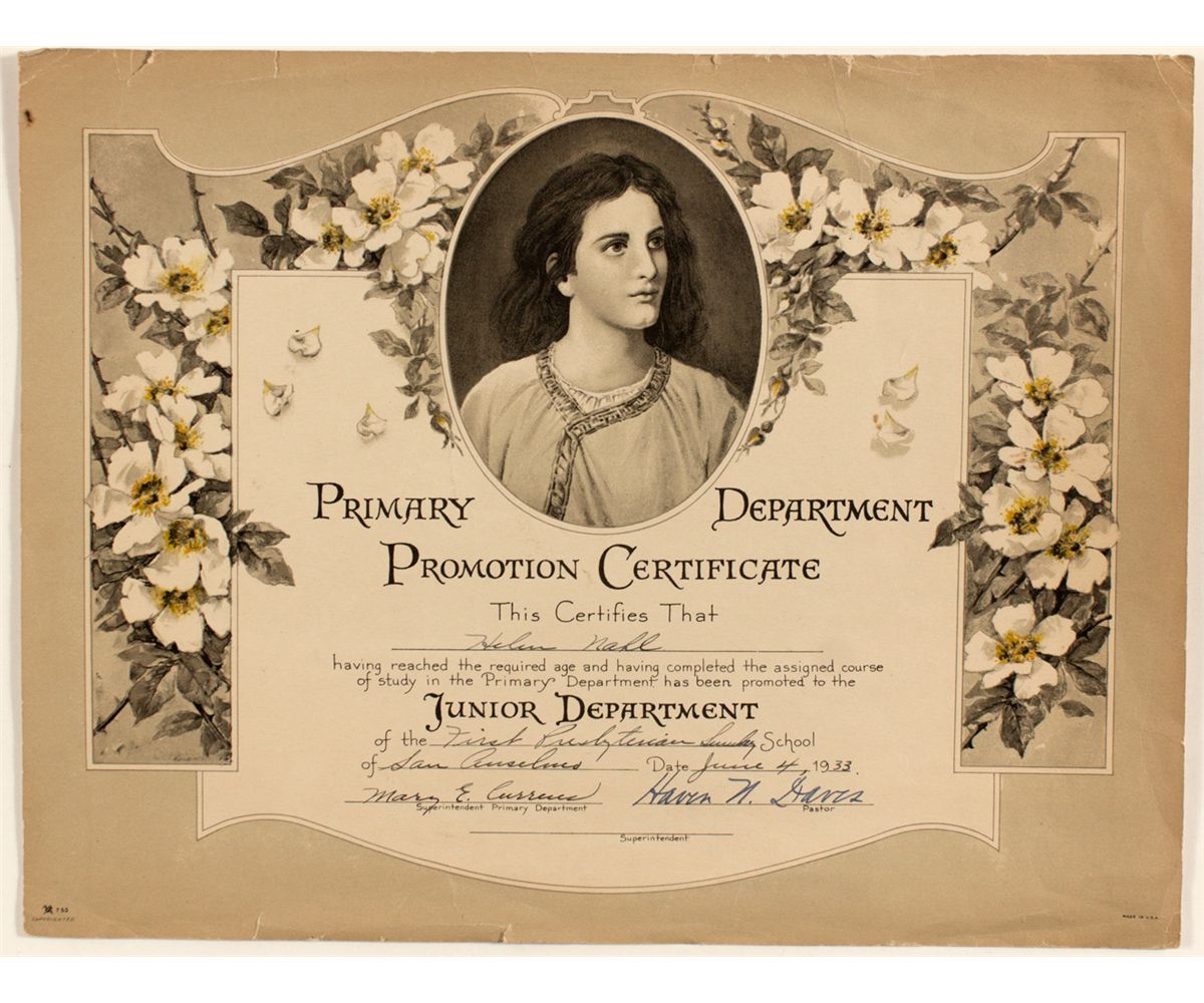 18. Primary Department Promotion Certificate for Helen Nahl, after completing the Primary department promoted to the Junior Departmentin 1933.