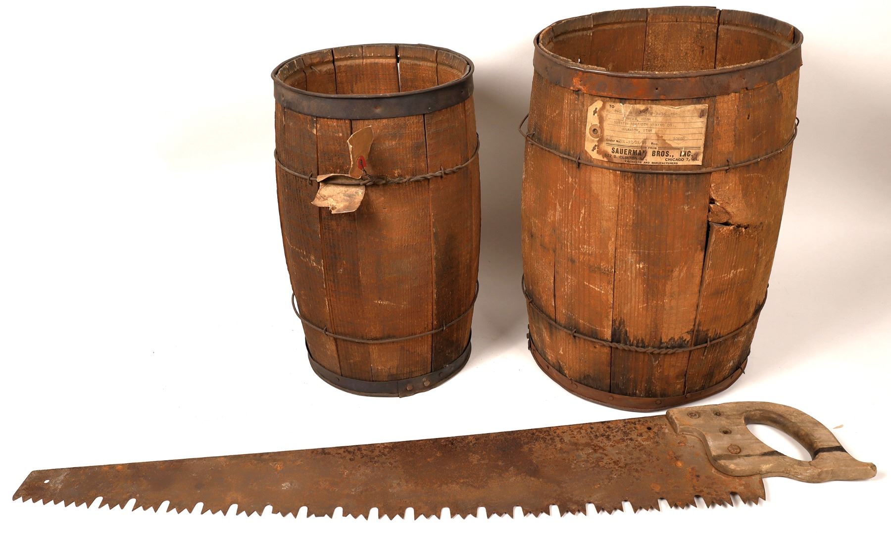 This is a working man’s group! 1) First barrel is for the Mammoth Mining Company of Mammoth, Utah. From Sauerman Bros. Inc. of Chicago. C1920’s to 1940’s. Sauerman had a line of mining equipment. Barrel is 18” high and 44” circumference. 2) Slightly smaller barrel. 17”. Tag with “CMI” on it. 3) Crosscut saw. 42” long. Series blade!!!