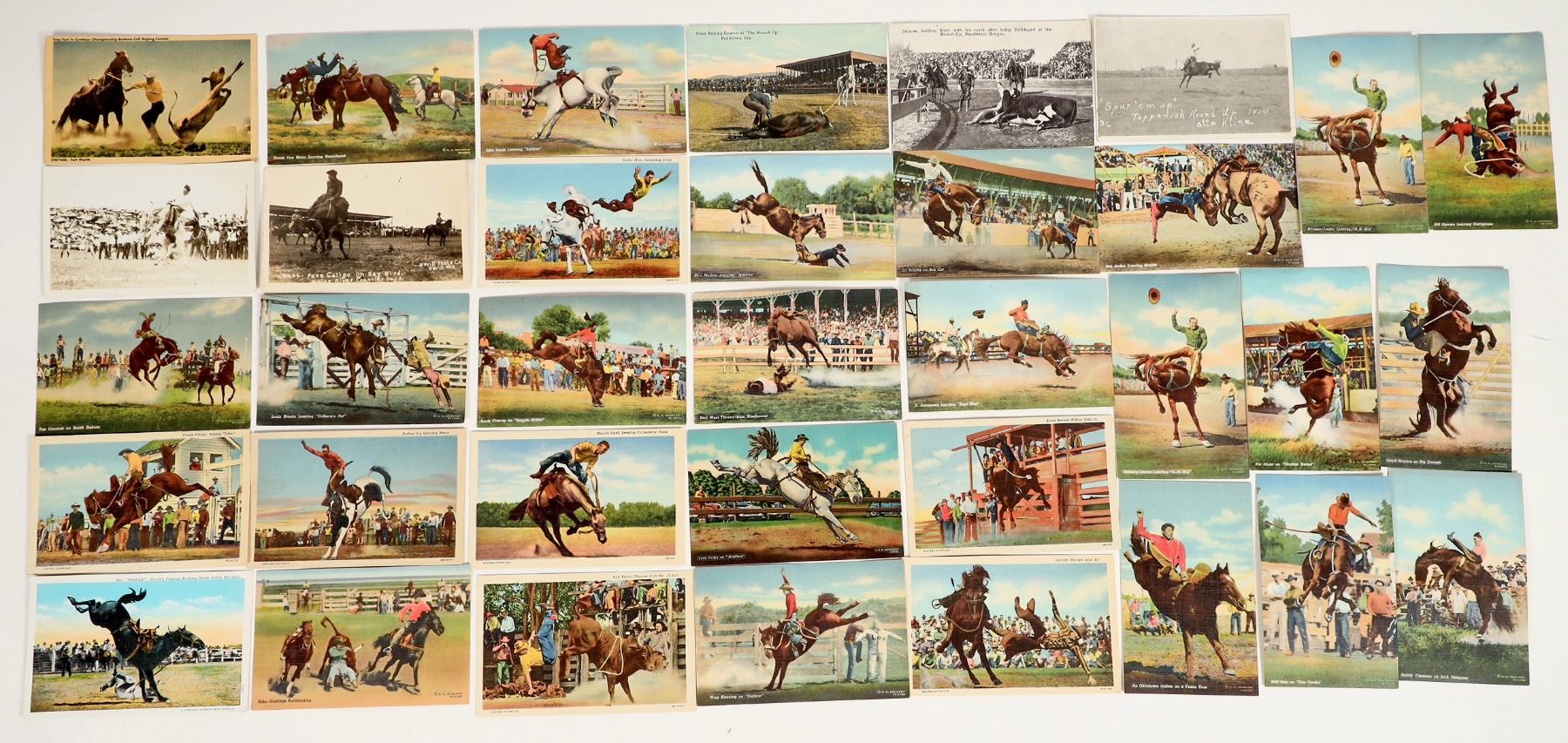 Lot of about 35 postcards, including 3 real photo. Most are linen. Feature cowboys that are identified including: Pete Galigo, Billy Kingham, Driscoe, Frank Van Meter, John Smith, Troy Fort, and more. Please inspect.