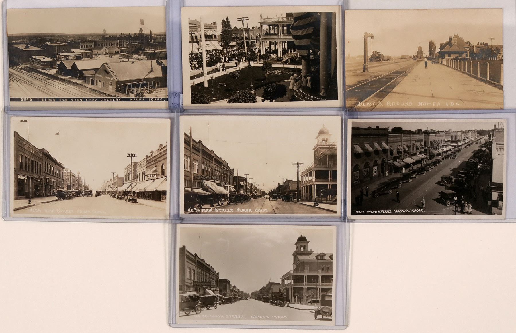 Nampa, Idaho Main Street postcards (4); Nampa Train Depot (1); Birds eye View from Nampa Brewery (1); View from Dewey Palace Hotel (1)
