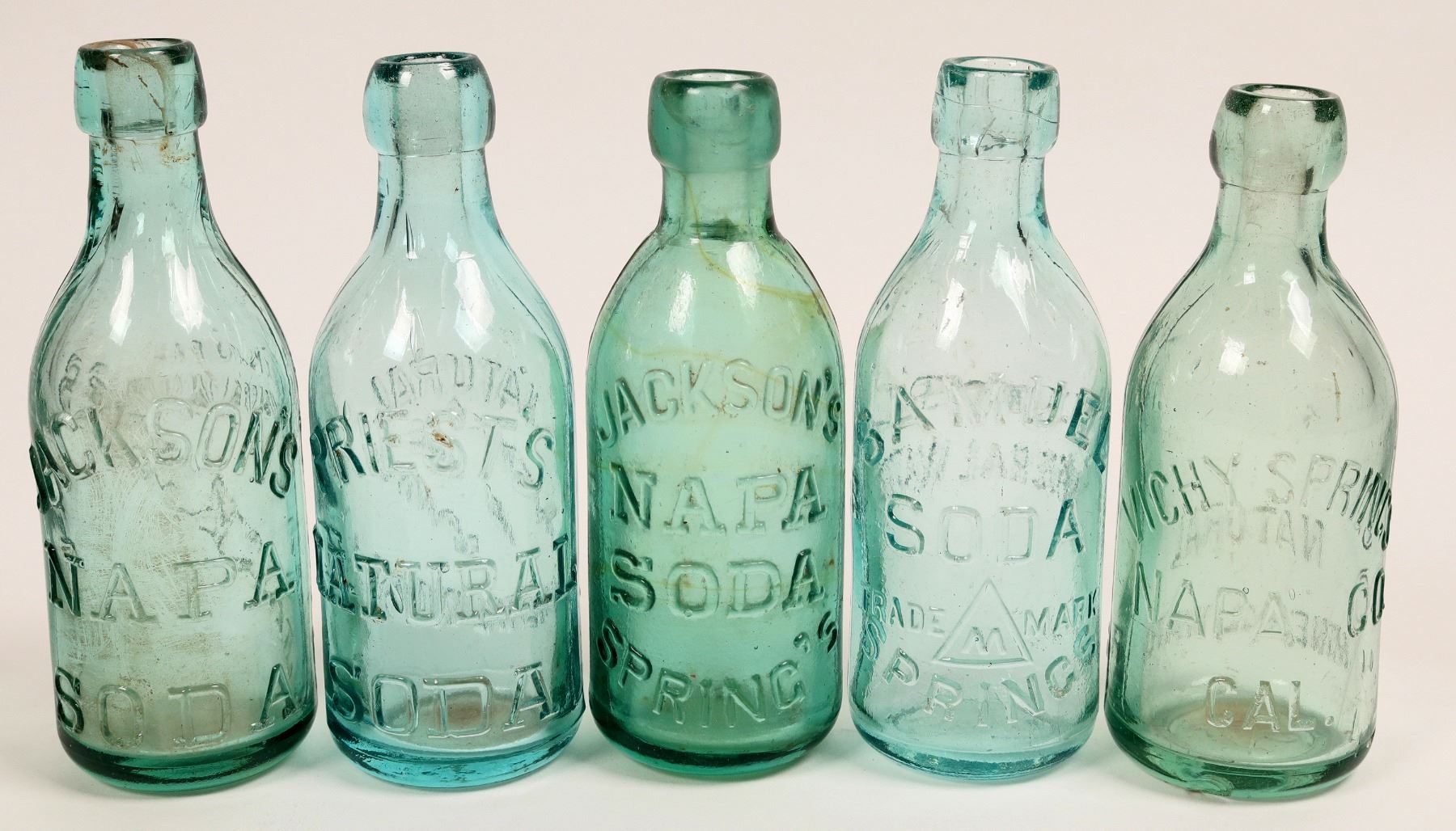 Nice group of 5 different aqua Napa Sodas, c1880-1900. Priest's Natural Soda, Bottled at the Spring; Jackson's Napa Soda, light lime aqua with an amber swirl; A different Jqcksons, the newer variety; Vichy Springs; SAmuel Soda Springs.