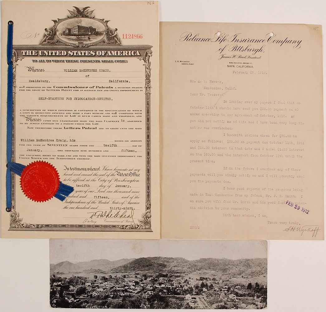 Lot of 4. 1) Panoramic two panel real photo postcard of Cloverdale. Unposted. 2) Bank of Cloverdale letterhead, Aug. 26, 1895. Tape repaired. Soiling. 3) Reliance Life Insurance Co. of Pittsburg, Napa, California office, dated Feb. 27, 1912. 4) 1915 patent application for William McKendree Craig of Healdsburg, California for self-starters for hydrocarbon-engines. Includes diagrams and detailed description. HWAC# 60026 Date: Location: California