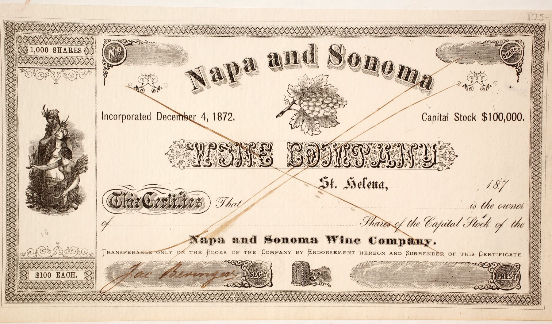 The company incorporated in 1872 with Charles Krug as president and Jacob Berringer as secretary. This is a rare signature piece from this company as Beringer has signed it as corporate secretary. Although this was never issued, it is rare that it was pre-signed by Berringer to be issued. This closely held company stock was "x" cancelled. This company was one of the first publicly traded wine companies.Signed "Jac Beringer". Krug and Beringer were pioneers of the California wine industry. Condition is VF. State: California City: St. Helena Date: HWAC# 90592