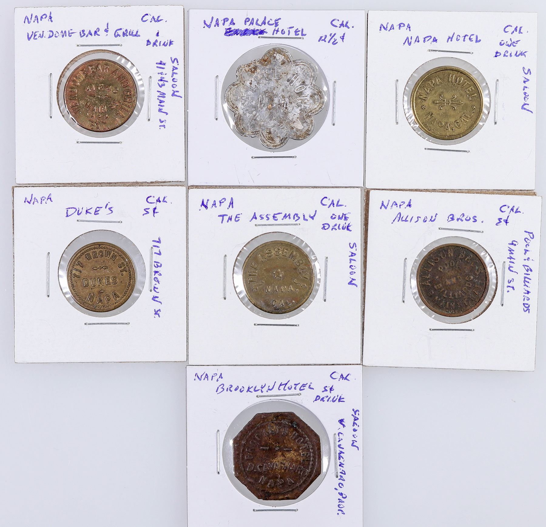 Lot of seven tokens from Napa: Brooklyn Hotel; Allison Bros.; The Assembly; Duke's; Napa Hotel; Palace Hotel; Vendome Bar & Grill.