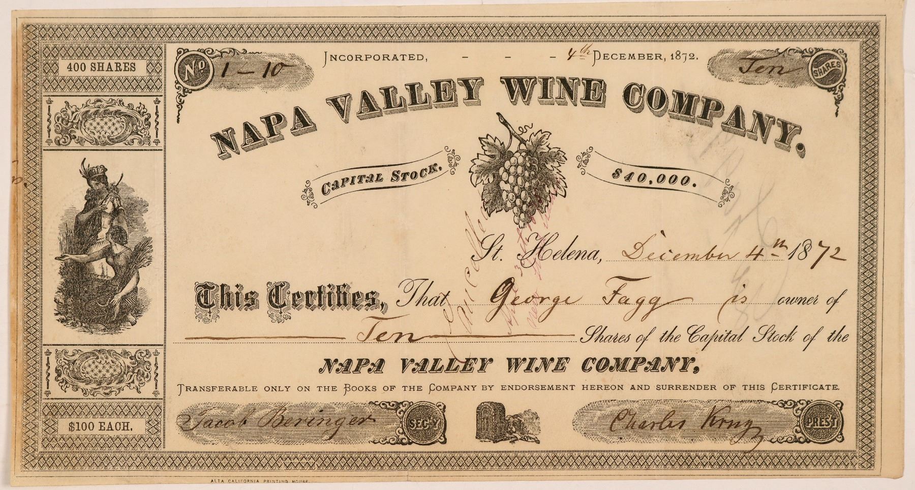Phenomenal. Two Napa Valley wine pioneers on one stock. Inc. December 4, 1872. This certificate is No. 1-10, so it counts for the first ten certificates issued. Issued to George Fagg on Dec. 4th, 1872 (day of incorporation) in St. Helena. Signed by Charles Krug as president and secretary Jacob Beringer. Pen cancelled. Black border and print, vignette of grapes (top center) and allegorical woman (left). Alta California Printing House. 5.5 x 9.75" Toning, very nice. The Napa Valley Wine Company was formed by Krug in 1872. It was renamed Napa & Sonoma Wine Company in 1874 after a fire destroyed the first winery. Beringer, after serving as secretary for this company, went on to form the Beringer Vineyards at St. Helena in 1876 with his brother Frederick. Ken Prag Collection