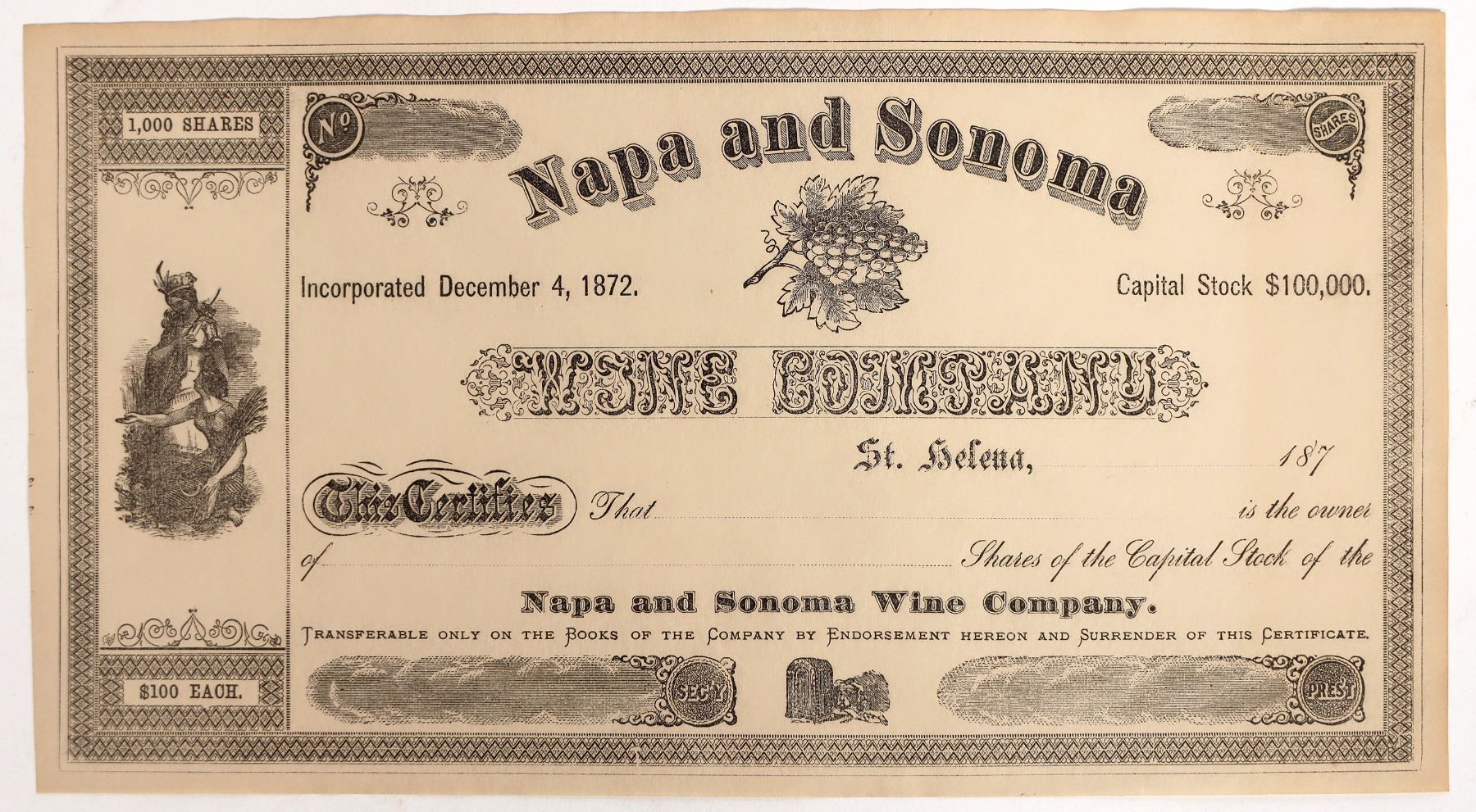 Unissued 187_ stock certificate for the Napa and Sonoma Wine Company. 10 x 5 inches, two vignettes.