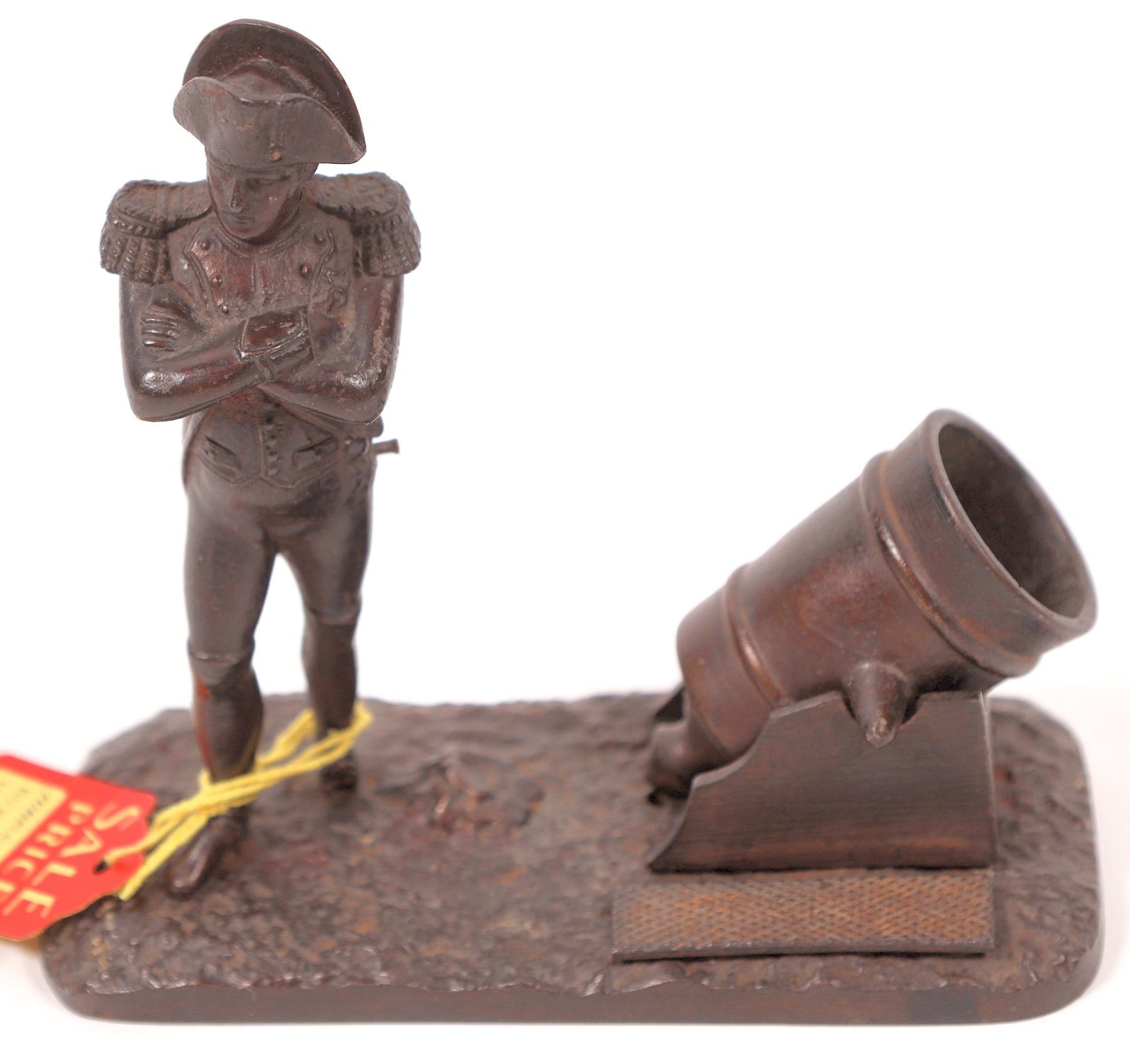 Napoleonic Bronze Match Holder w/Striker. Statue of Napoleon, arms crossed, standing next to cannon barrel where matches are placed. Cannon barrel removable from structure built up on base. Engraved onto barrel are the words Marengo Wagram Austerlitz commemorating three decisive victories in the Napoleonic wars from 1800, 1805 and 1809 respectively. In front of cannon barrel is the flat, rectangular match striker. Base dimensions: 5 1/2" x 2 1/2". Height of Napoleon statue from base is 4 3/4". Weight: approx. 1.6 1bs. Not dated but possibly mid-late 19th century.