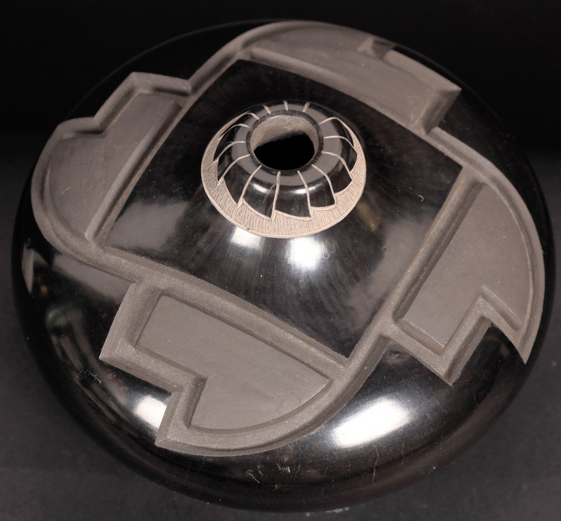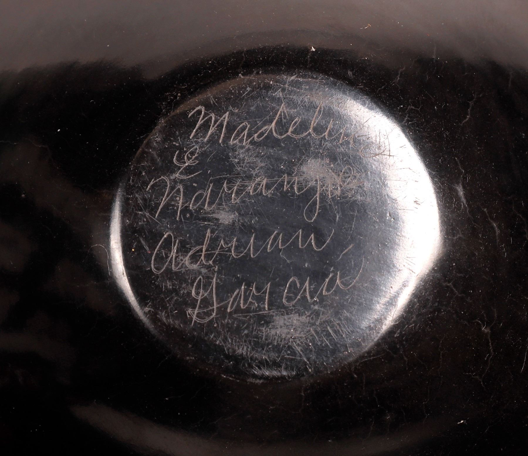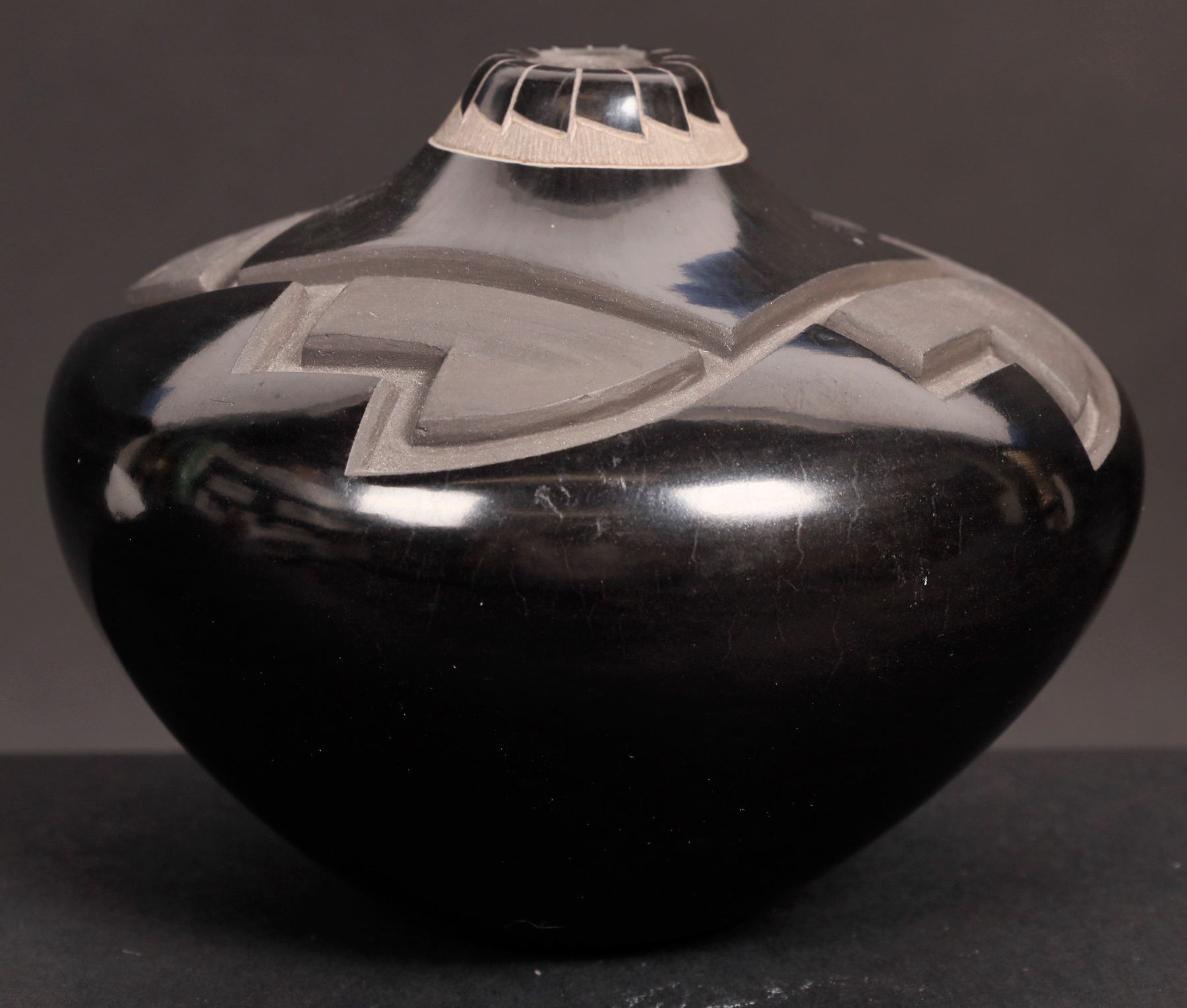 Madeline E. Naranjo and Adrian Garcia (signed jar) of Santa Clara Pueblo specialize in hand coiling in the traditional Santa Clara style, but added their unique contemporary flare. Their black pottery is deeply carved in elegant designs. 3.25"x 4".