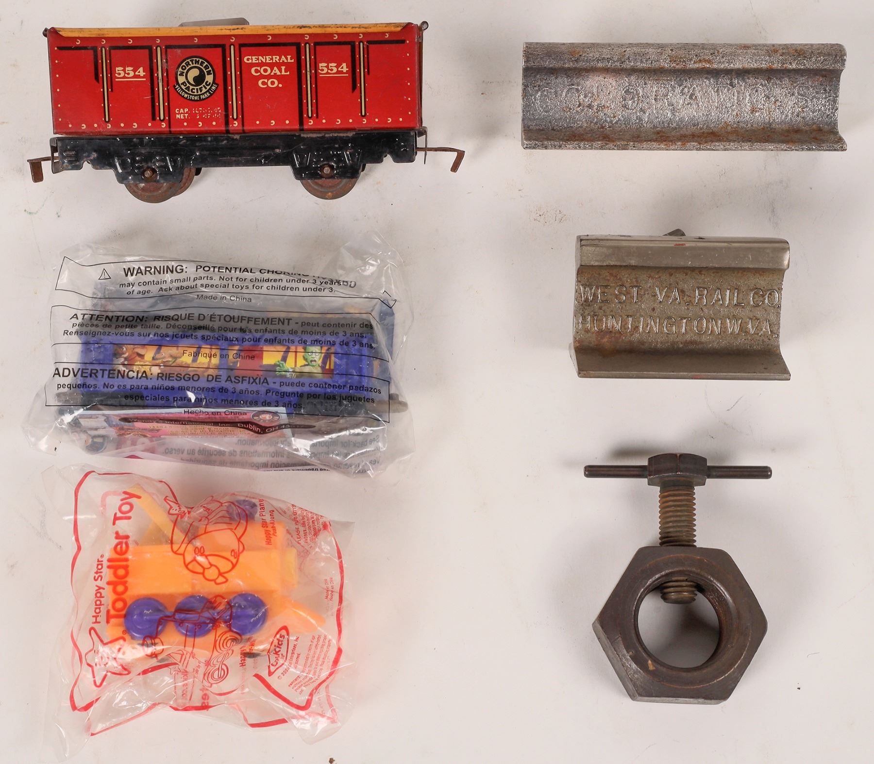 Small samples of self identified narrow gauge track. 3" West Va. Rail Co, Huntington, W Va. 5" Colorado S?? 3x small railroad toy cars. 2" metal nut nutcracker.