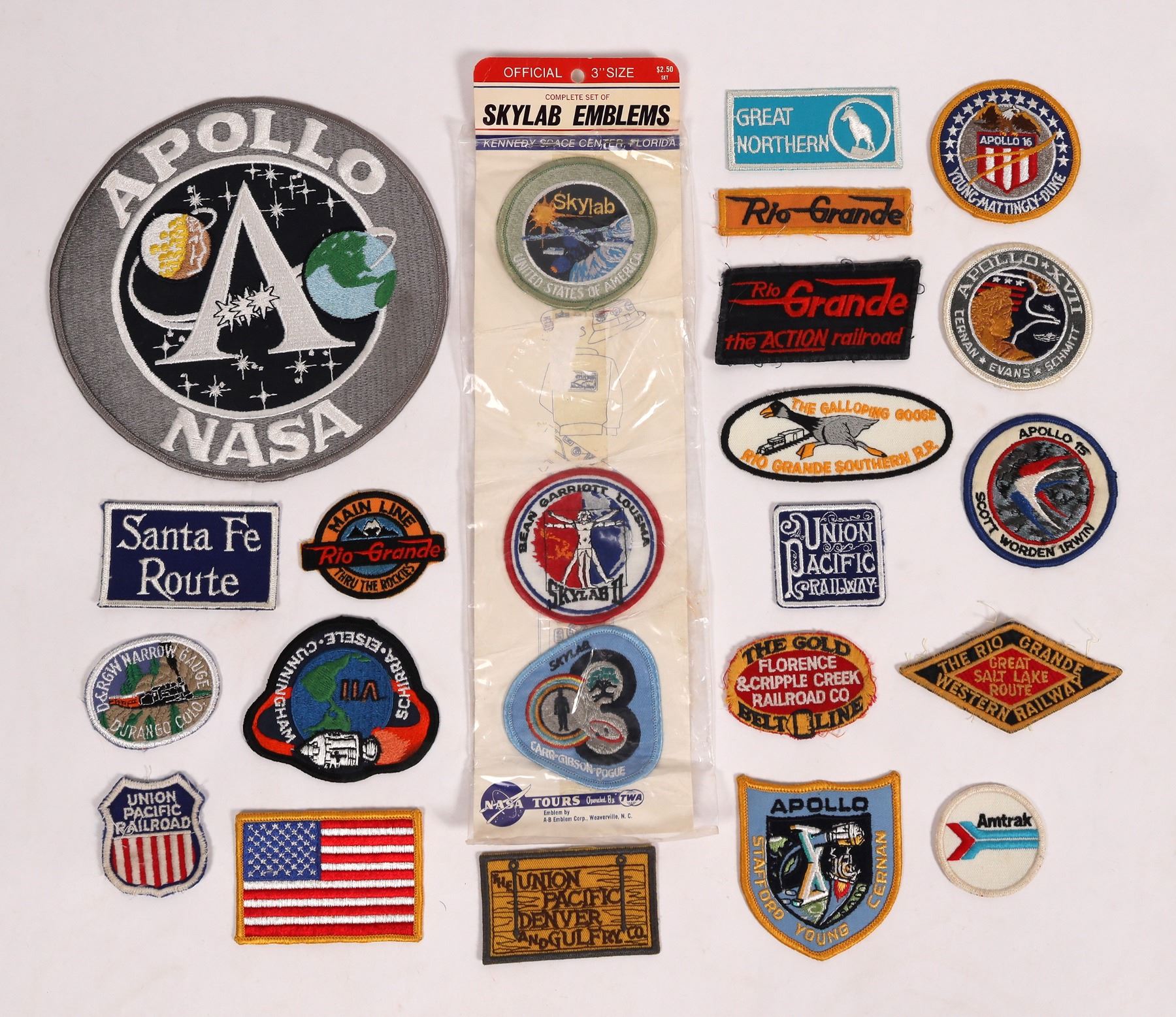 Group of Nasa and railroad cloth patches. 7.5"Apollo, 3x 3" Skylab, 3" Apollo VII, X, 15, 16, XVII. Group of railroad patches- Santa Fe Route, Union Pacific Denver, Florence & Cripple Creek Railroad, D&RGW Narrow Gauge, Amtrak, Great Northern, Rio Grande, Great Salt Lake Route, The Galloping Goose and more.