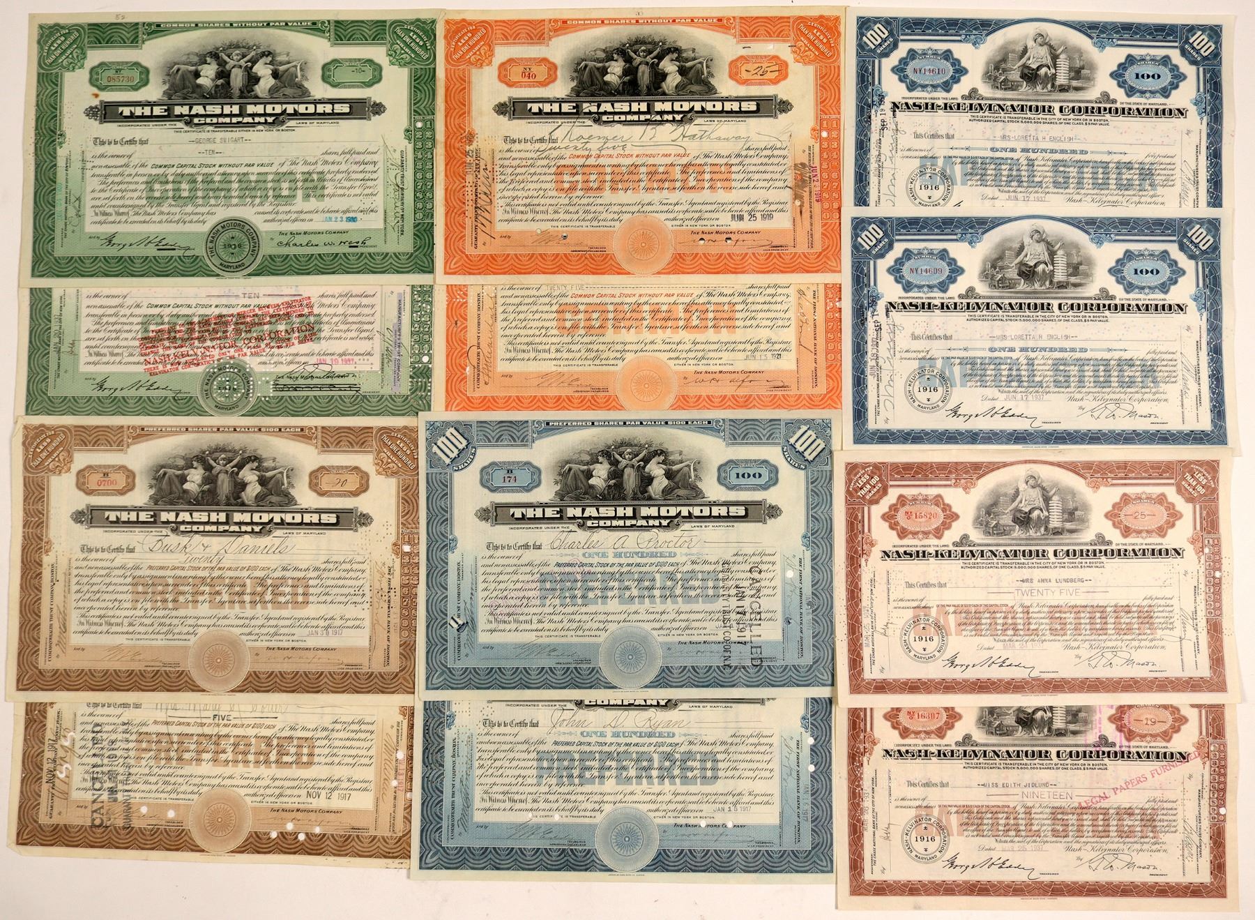 Lot of 12. 1) Nash-Kelvinator Corporation. Four stocks, 2 varieties, issued in 1937. 2) Nash Motors Company. Eight stocks, 4 varieties, issued 1917-1937. All cancelled. Founded in 1916. Based in Kenosha, Wisconsin. Responsible for some important innovations including the heating and ventilation system (1938), unibody construction (1941), seat belts (1950), a US built compact car in 1950, and muscle cars in 1957. Ken Prag Collection
