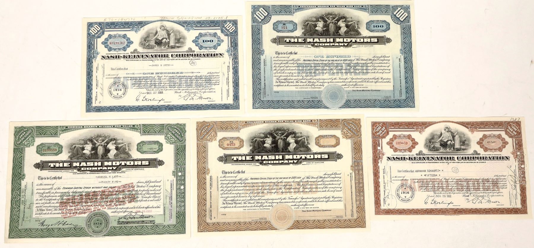 5 different Nash stocks. 1951 and 1952 blue and brown Nash Kelvinator. 1937 and 2 unissued-brown, blue, green.