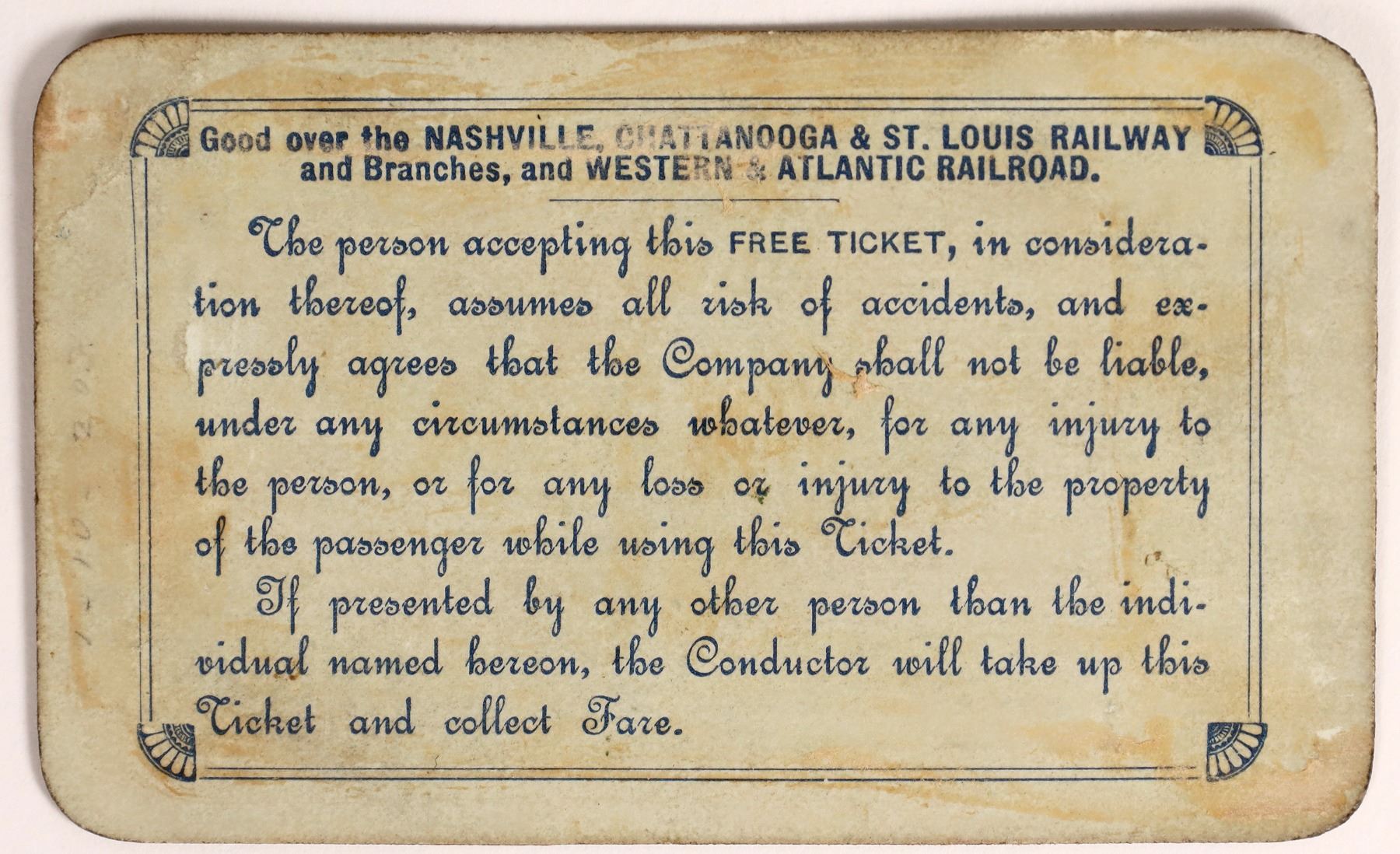 Pass No. 1081 issued for 1891 to DR Thomas, secretary to president of W&TRR Co. Signed by the president. Blue print on cardstock. Agricultural and boat vignettes. Printed by American Bank Note Co. Adhesive residue on reverse. Known as the "Dixie Line." Operated 1851-1957 in Kentucky, Tennessee, Alabama, and Georgia. Succeeded by Louisville and Nashville Railroad.