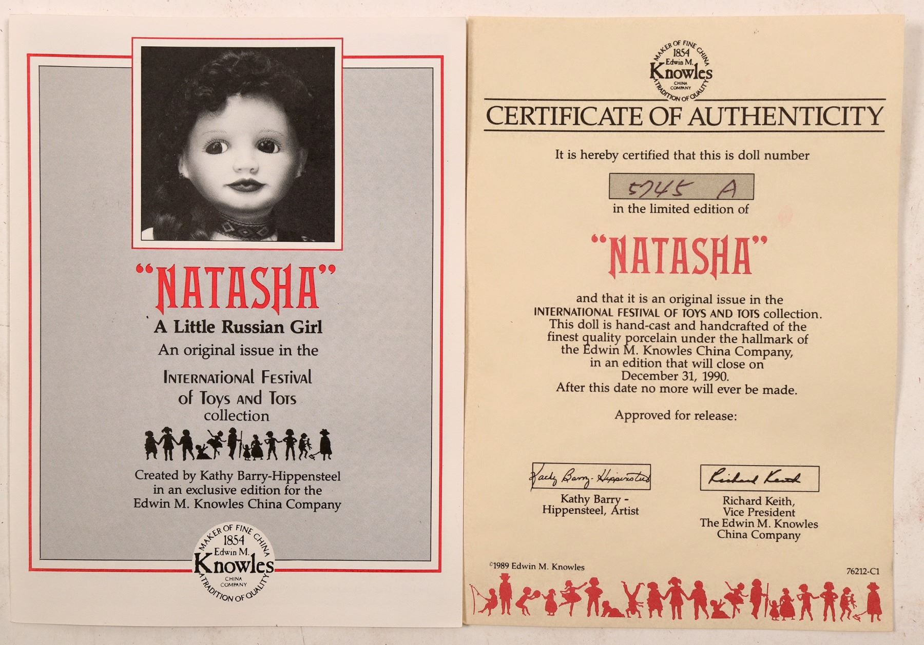 This is a little doll called Natasha "the little Russian girl" designed by Kathy Berry Hippensteel and distributed by Ashton-Drake and Knowles. Little Natasha (15 in) comes to life with her little bear doll too. NIB. COA #5745 A.