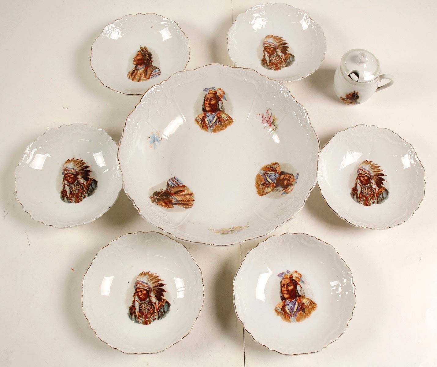 Lot of 10: Large fruit bowl with 3 Indian chiefs. 9.75" diameter x 2.5" high. Six smaller bowls, images of Native American Chiefs, 5.75" diameter x 1.25" high. Also includes a jam or condiment jar withlid and spoon, 3.25" h x 2.5". A very nice set. Date: Location: HWAC# 71057