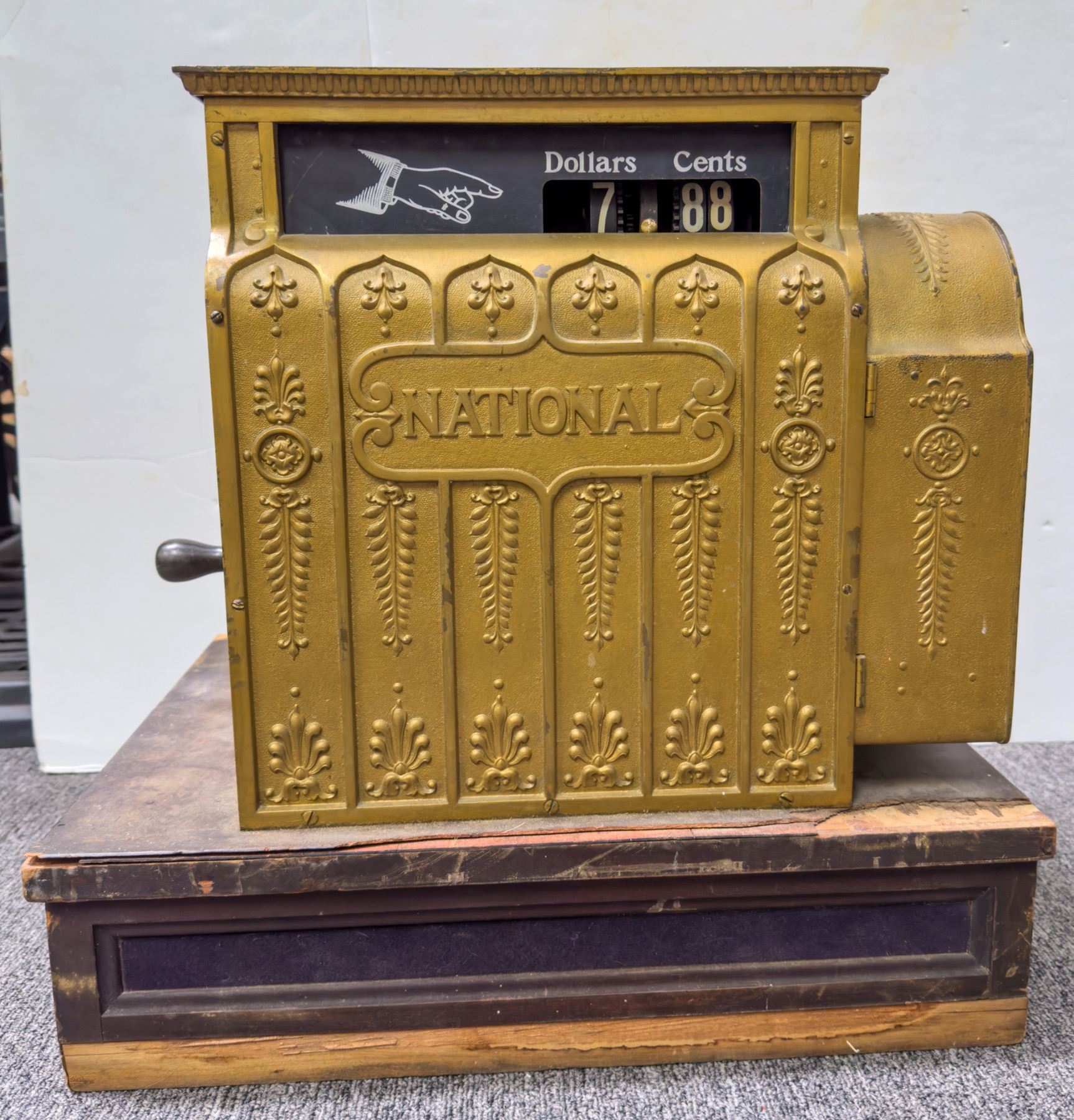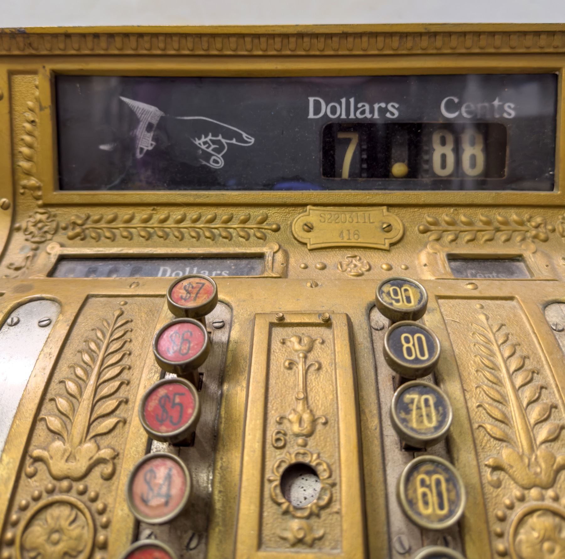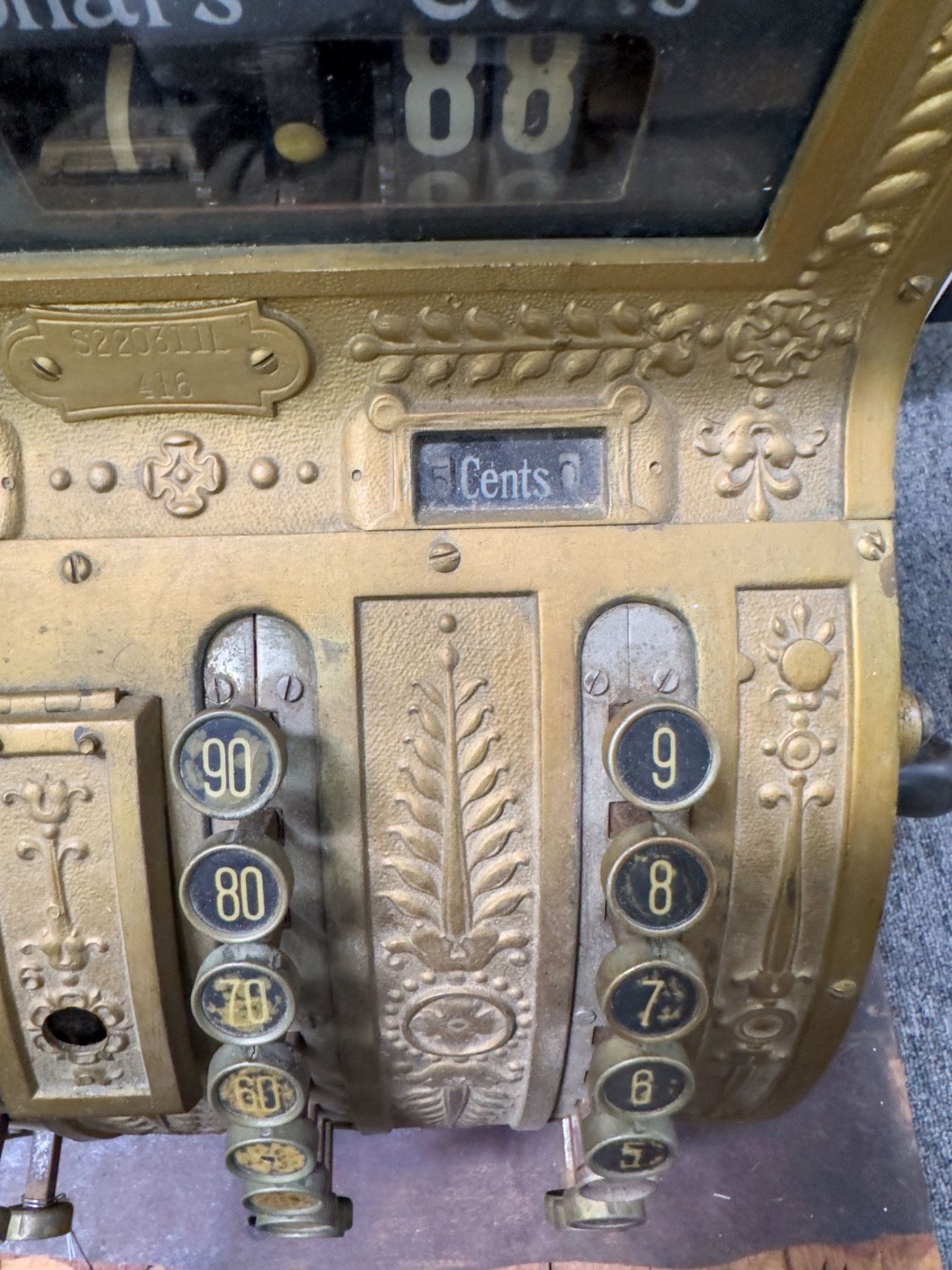National 416 brass cash register. Working condition and drawer opens. Wood base needs restoration. This register is big and heavy, local pickup is preferred or please make your own shipping arrangements.