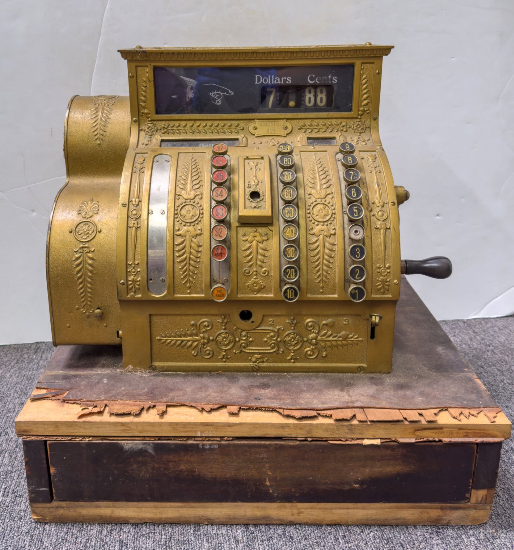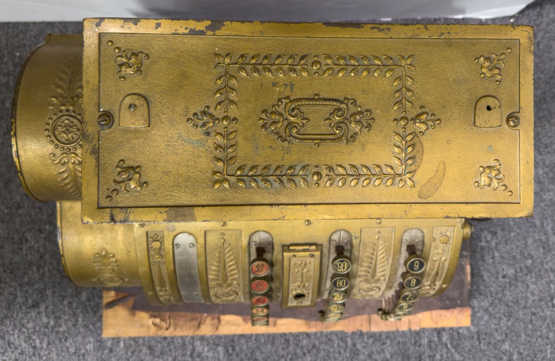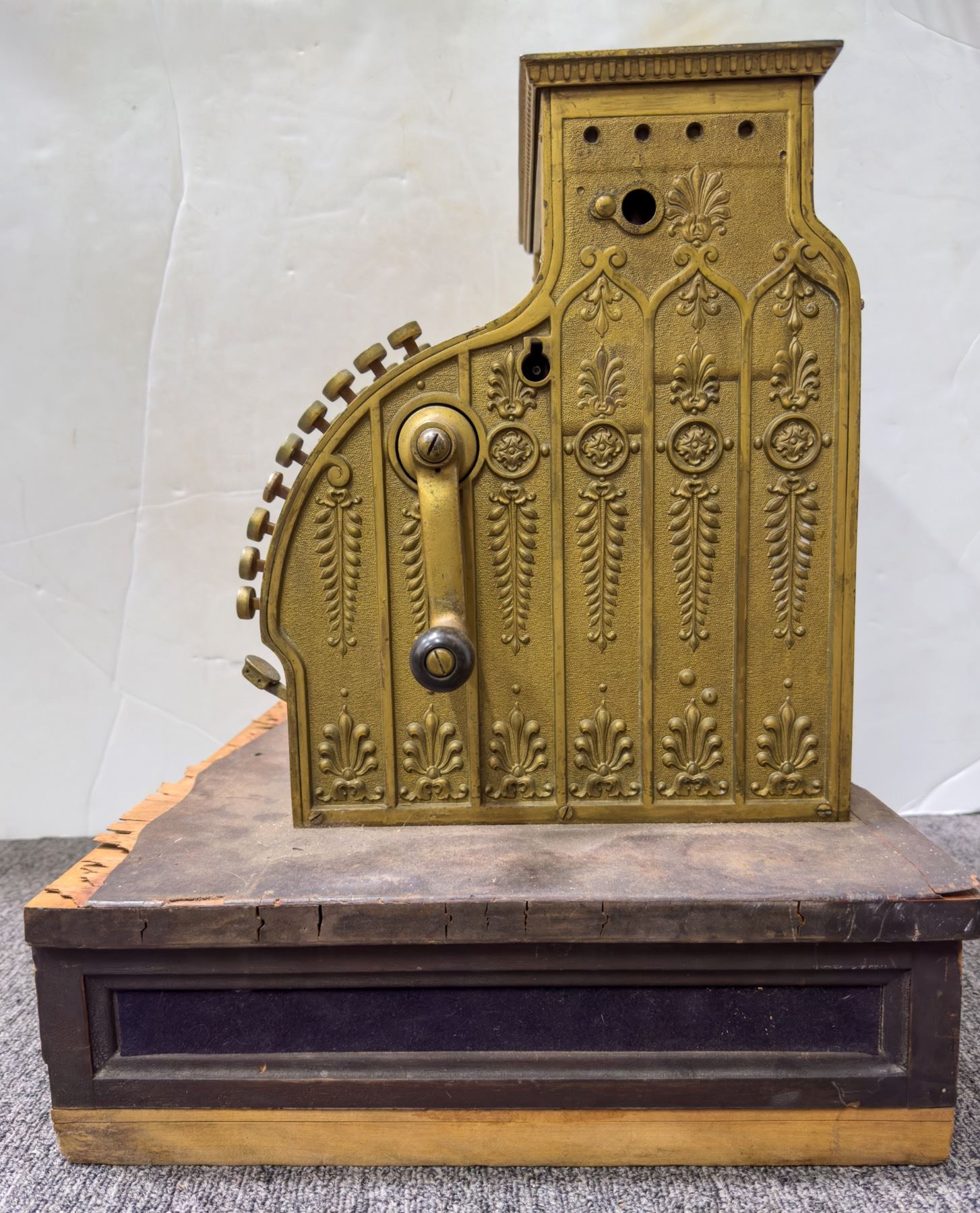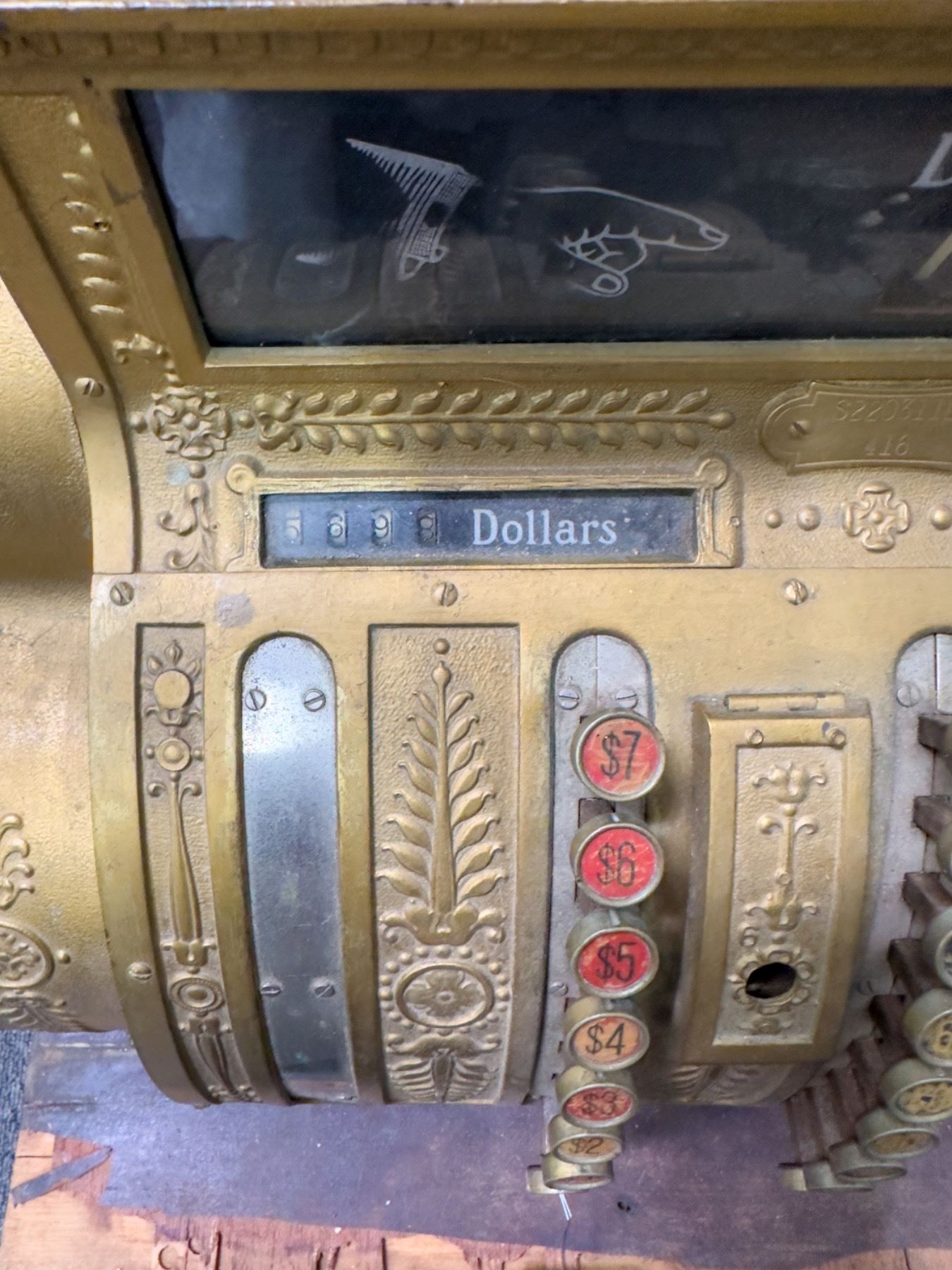 National 416 brass cash register. Working condition and drawer opens. Wood base needs restoration. This register is big and heavy, local pickup is preferred or please make your own shipping arrangements.