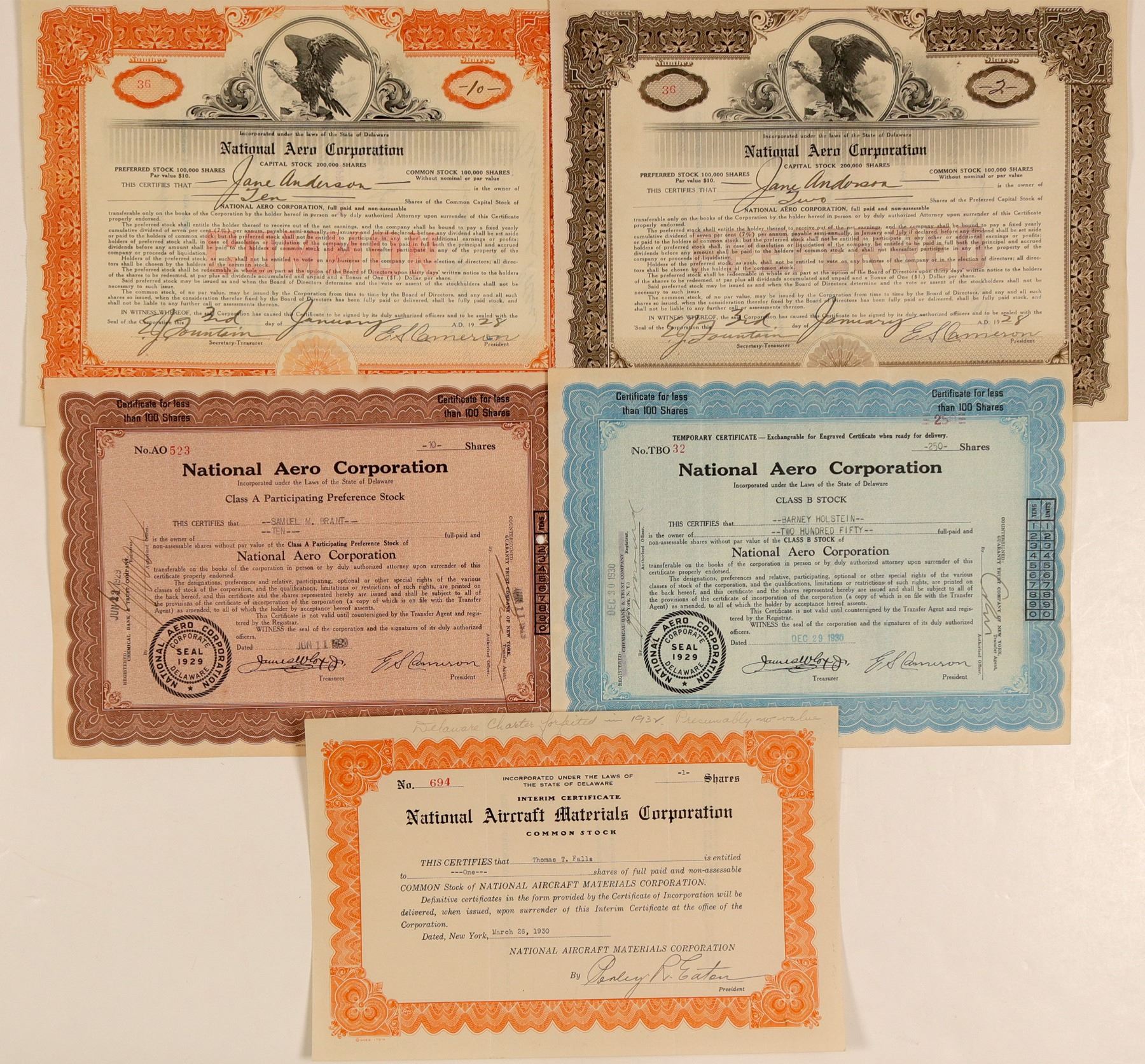 Lot of five different. 1) Two are National Aero Corp. with eagle vignette and either orange or brown borders, issued in 1928. 2) Two are National Aero Corp. with either brown border & background or blue border & background, issued 1929 and 1930 (one is temporary). 3) The last is National Aircraft Materials Corporation, issued 1930. Orange border, not vignette. Folds, some toning to group. We found a 1929 ad for the company in Flying Magazine selling the Cameron 60 horsepower engine. Ken Prag Collection