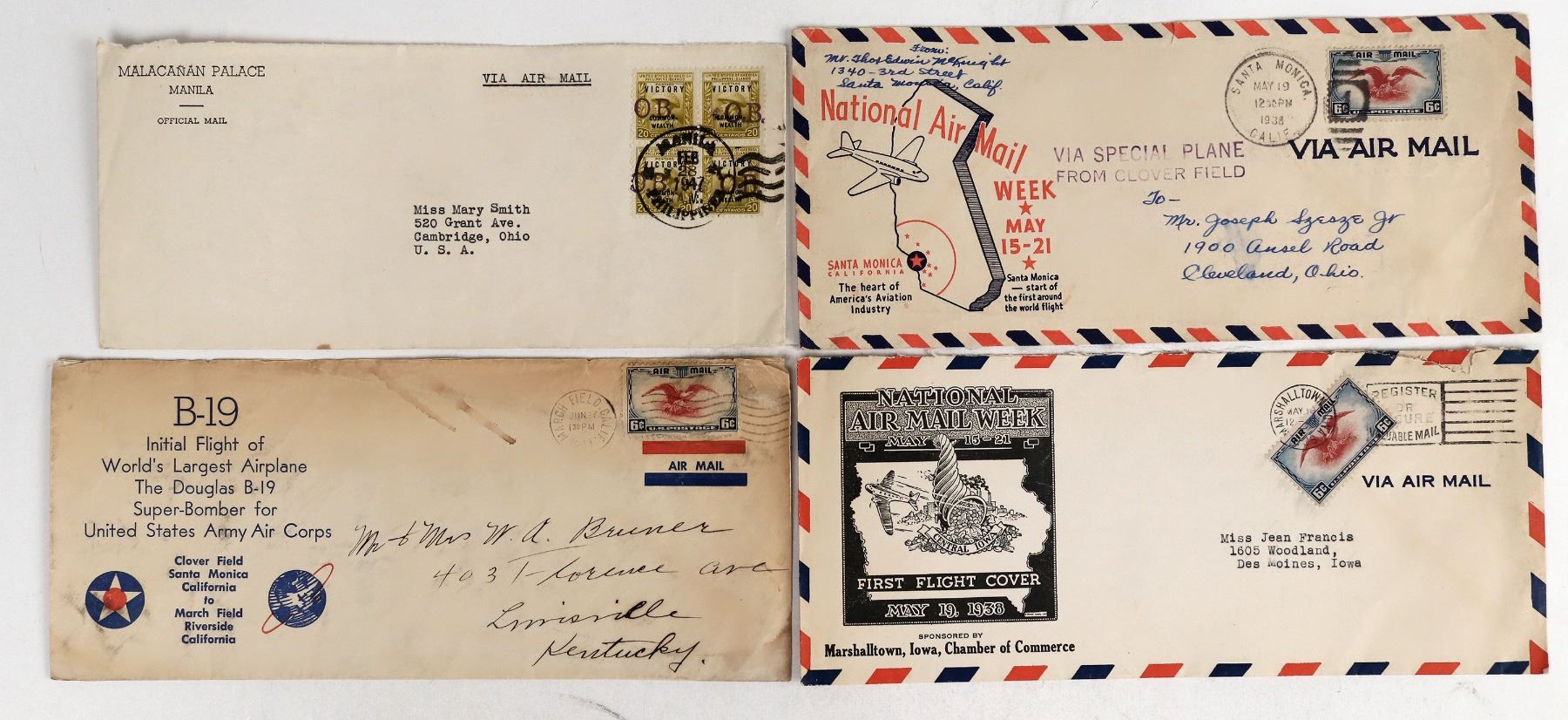 4 mostly cacheted c. 1938-47 National Air Mail Week covers. Marshalltown, Santa Monica, March Field, Manila.