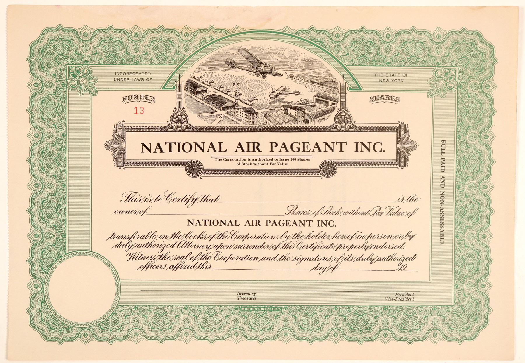 Unissued number 13. Green border, black print, and vignette of air show. Printed by Broun-Green Co., NY. 8.5 x 12.5" Water damage along top left border. From an Oct. 12th, 1933 New York Times Article: "Despite the crowds that saw the National Charity Air Pageant at Roosevelt Field last Saturday and Sunday, it was revealed yesterday that the show had ended with a large deficit. A petition in bankruptcy was filed by the National Air Pageant, Inc., signed by John S. Reaves, its president, through Hardin, Hess Eder, attorneys for the corporation." The article notes a $40,368 loss. 75,000 visitors were reported. Ken Prag Collection