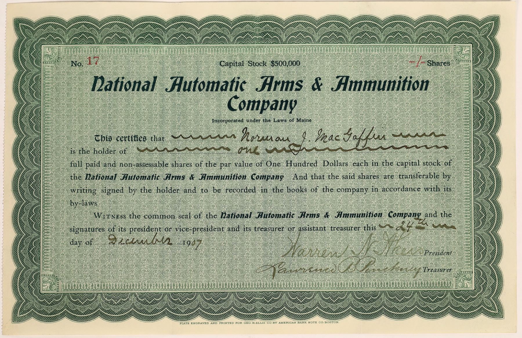 This is a stock certificate for the National Automatic Arms and Ammunition Company issued the 24th of December 1907 for one share valued at $100. The stock has a beautiful green ink background and border, folds are light and without any perforations. The signatures of the owner is Norman MacGaffin and the President of NAAA Co., Warren Akers are present front and back. A compression seal is visible in the lower left corner. No information located.