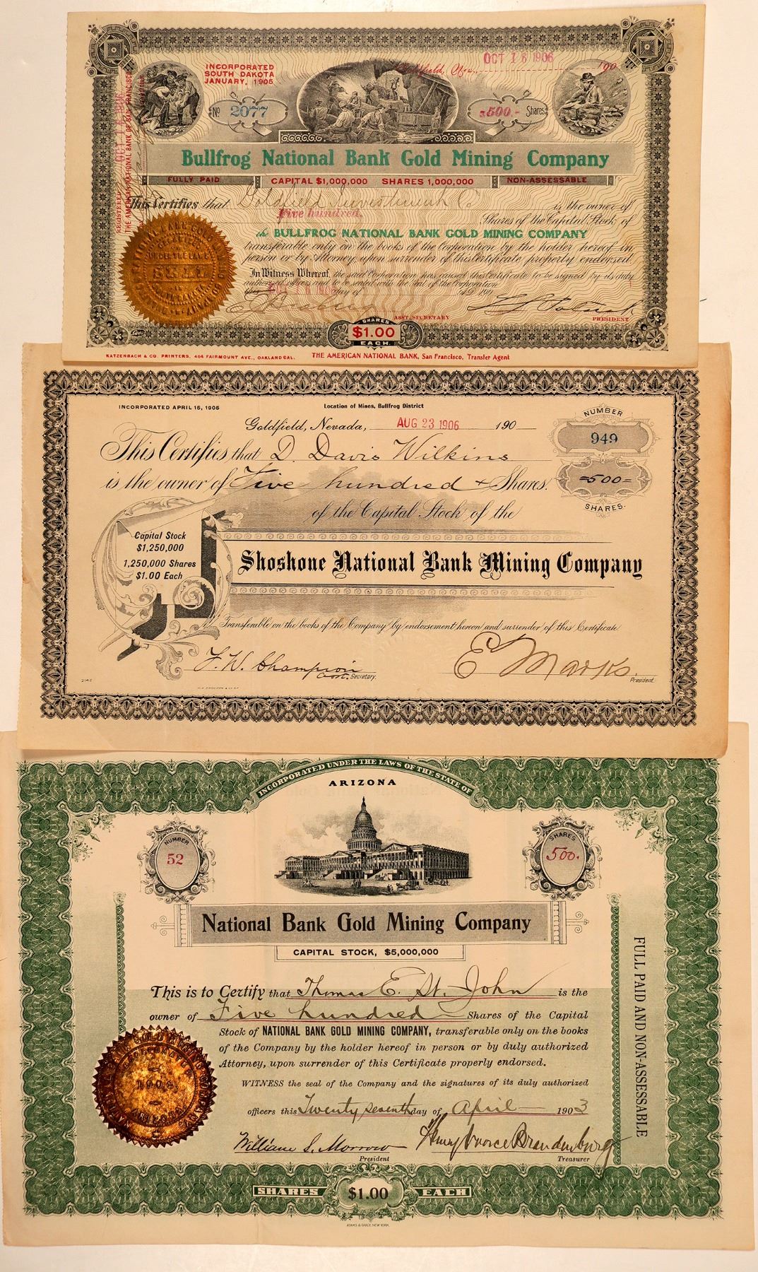 Lot of 3 different. 1) Shoshone National Bank Mining Company. Issued in 1906 for 500 shares to D. Davis Wilkins in Goldfield. Signed by president Marks and secretary Champion. Not cancelled. Black border and print, fancy logo. Folds, toning, bent corners. 2) Bullfrog National Bank Gold Mining Company. Issued in 1906 to Goldfield Investment Co. Signed by the president and asst. secretary. Not cancelled. Black border, black and green and red print. Three mining vignettes. Pinholes, folds. 3) National Bank Gold Mining Company. Issued in 1903 for 500 shares to Thomas St. John. Signed by treasurer Henry Brendenburg and president William Morrow. Not cancelled. Green border, black print, and vignette of capitol building. Folds. Ken Prag Collection