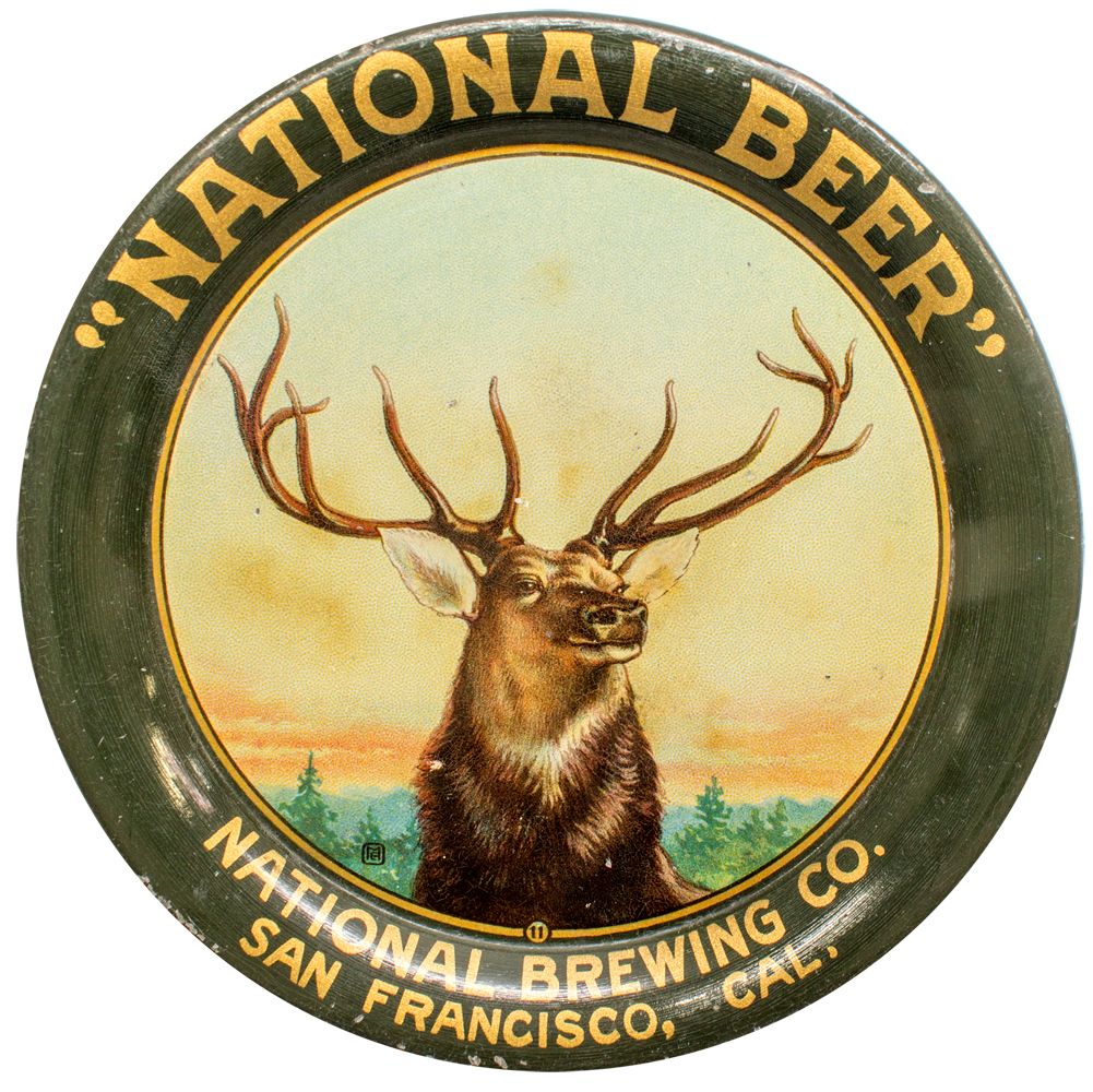Gold lettering: "National Beer. National Brewing Co. San Francisco, Cal." Vignette of an elk (that appears to be smiling) with forest and sunset behind. Green border. Measures 4 1/4" in diameter. Chips to paint on rim.
