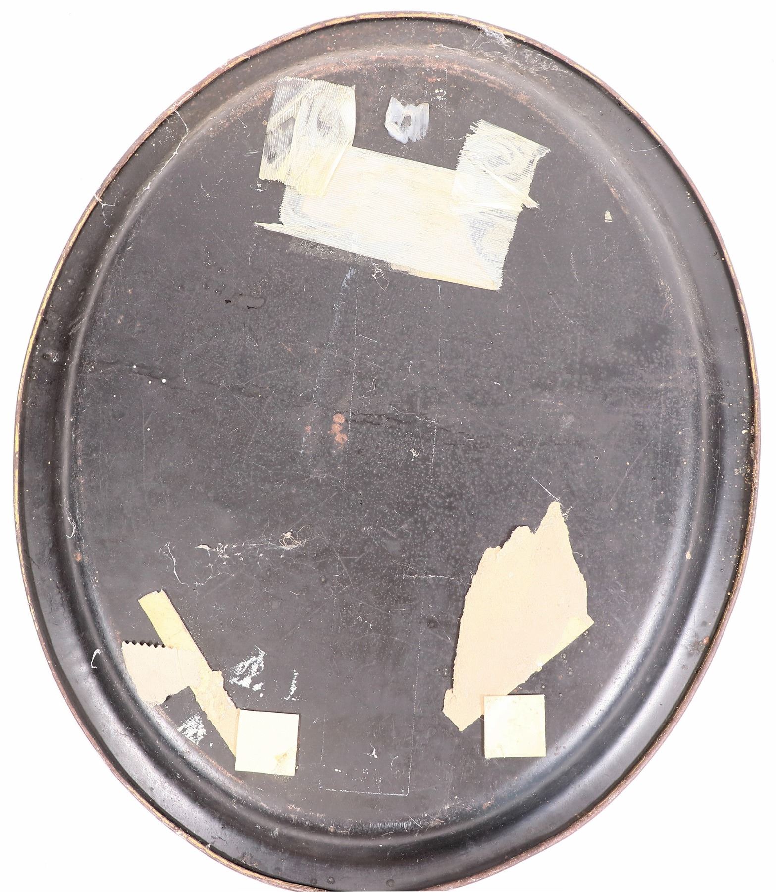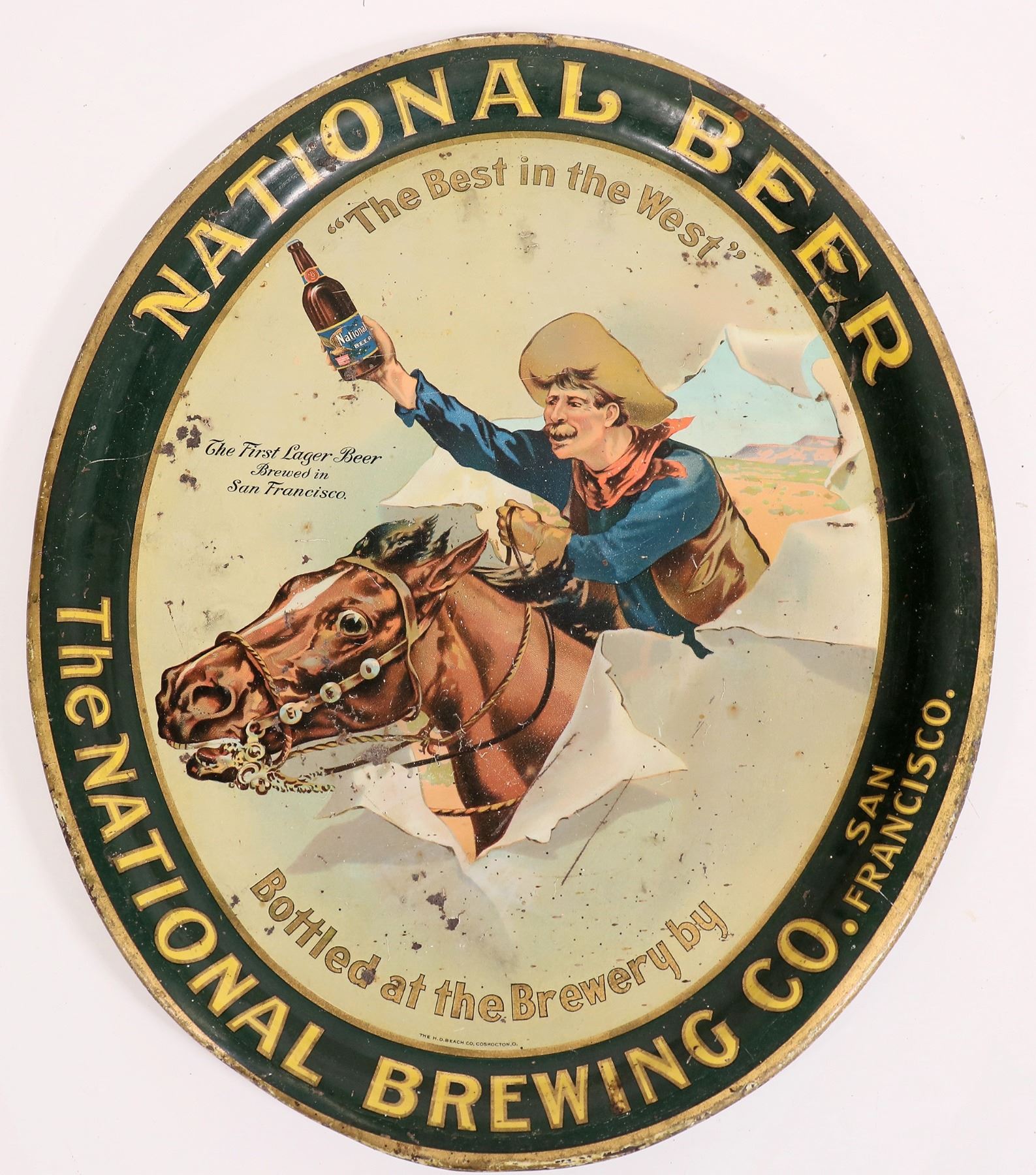 This oval beer tray is made for the "National Brewing Co./ San Francisco/ National Beer/ The Best in the West/ the first lager beer brewed in San Francisco". An oval tay measuring 12.75 in. X 16 in. depicting a cowboy tearing through scene with a bottle of beer in his hand. Minor dent, scuffs on the base, light oxidation on the base, wear on the edges. Fair to Good condition. Pre-pro. San Francisco California