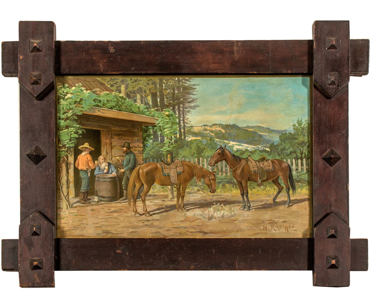 "In the Sonoma Mountains." Scene: Three prospectors/cowboys (one with a revolver) are sitting around a barrel enjoying glasses of beer. Two beer bottles are present. Artist is H. Raschen. "Compliments of National Brewing Co., San Francisco, Cal." Louis Roesch Co. Lith., SF. Copyrighted 1909. Broadside measures 21" x 14 1/2" in a 27" x 20 1/2" frame. H(enry) Raschen (1854-1937) was born in Oldenburg, Germany, came to Ft. Ross, CA in 1868, and operated in Oakland. One of his specialties was Native Americans (1883-1890). Burt Collection [Ref: Who Was Who in American Art, pg. 505, 1985]