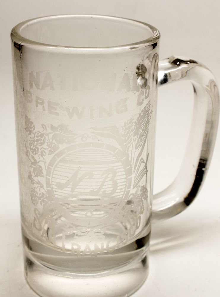 5 x 2 1/2". Etched "National Brewing Co. / San Francisco." Very large logo and scroll work. Burt Collection.