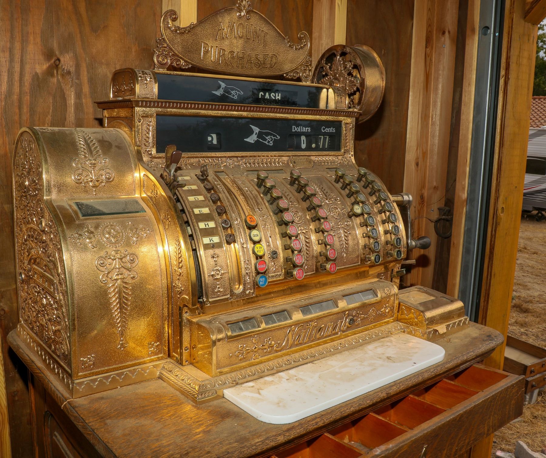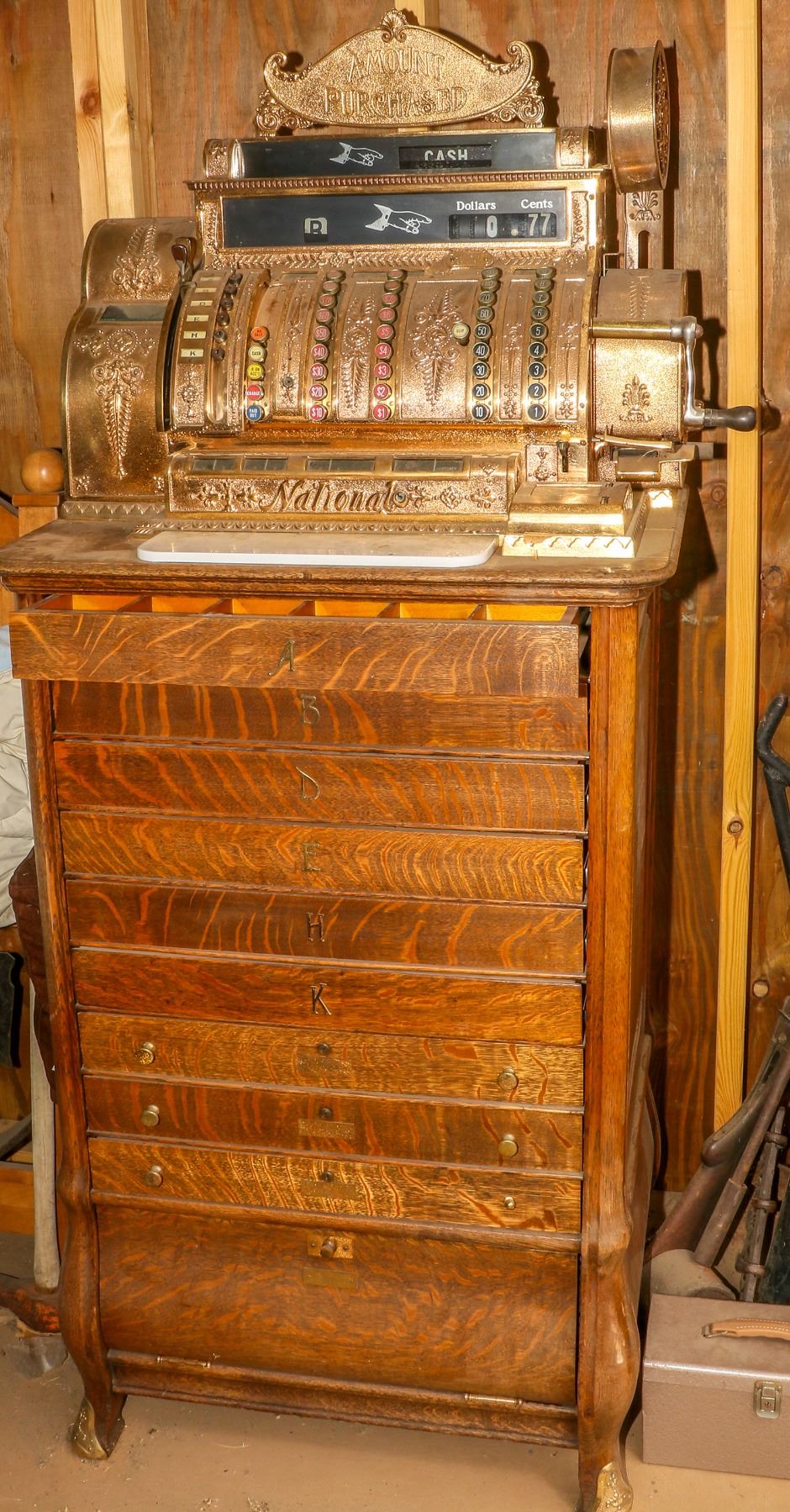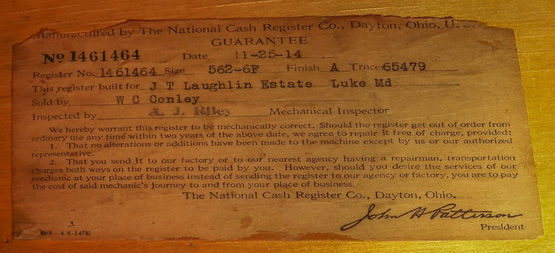 National Cash Register No: 1461464 Manufacturer Guarantee Date Nov. 25, 1914. Made by the National Cash Register Company of Dayton, Ohio. Mint condition, exquisite design and durability, typical of the first decades of the 20th century. Original mechanism and intricate details. Information on Manufacturer Guarantee in bottom of drawer. Size 562-6F. Finish: A. 9-Drawer Cash Register. Class 500. Patented 1904. Guarantee has salesman's name and inspector's name, sign by President of company John Patterson.
