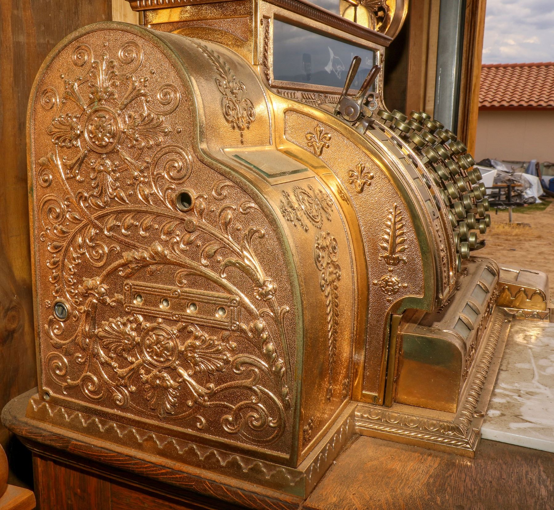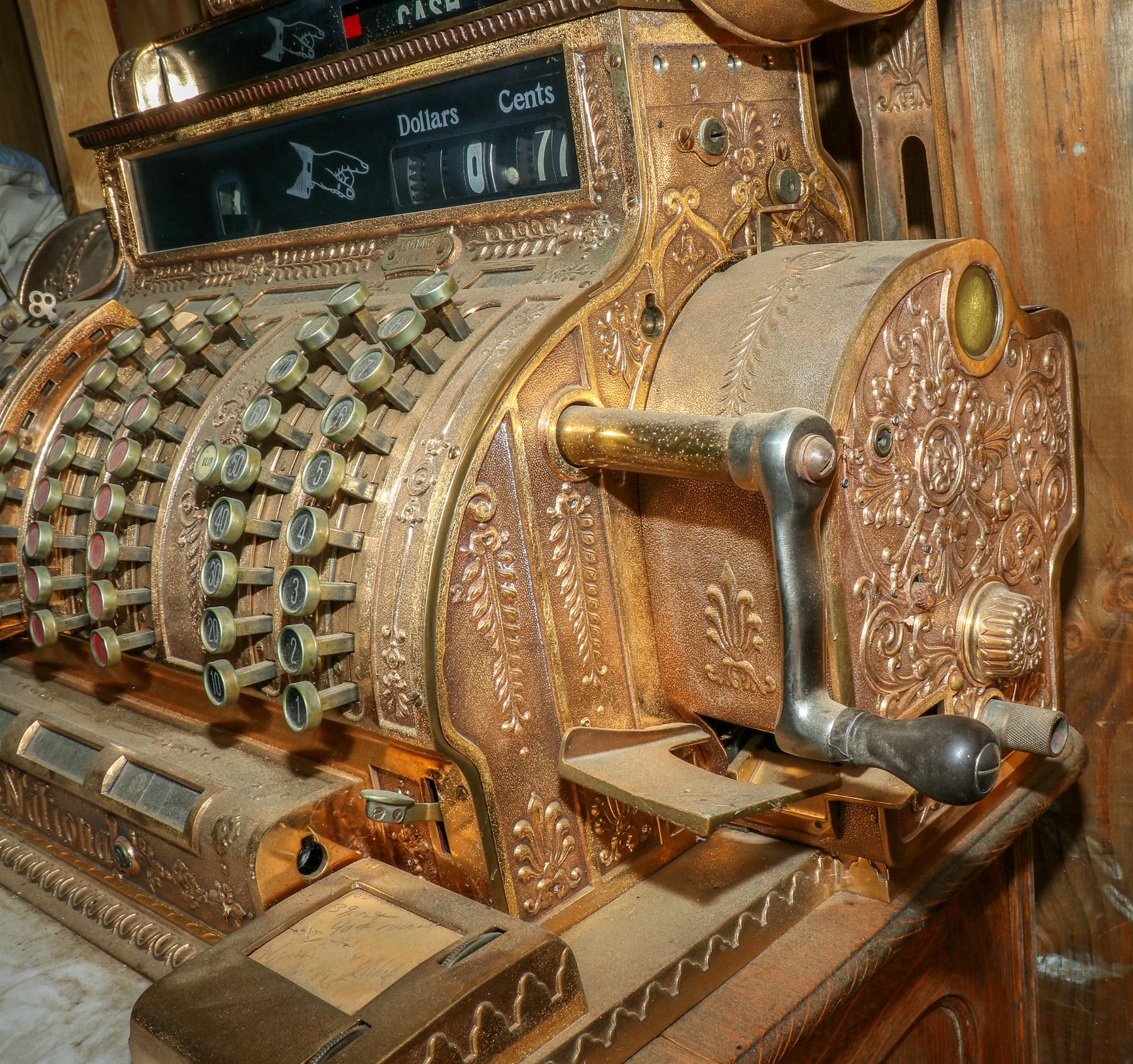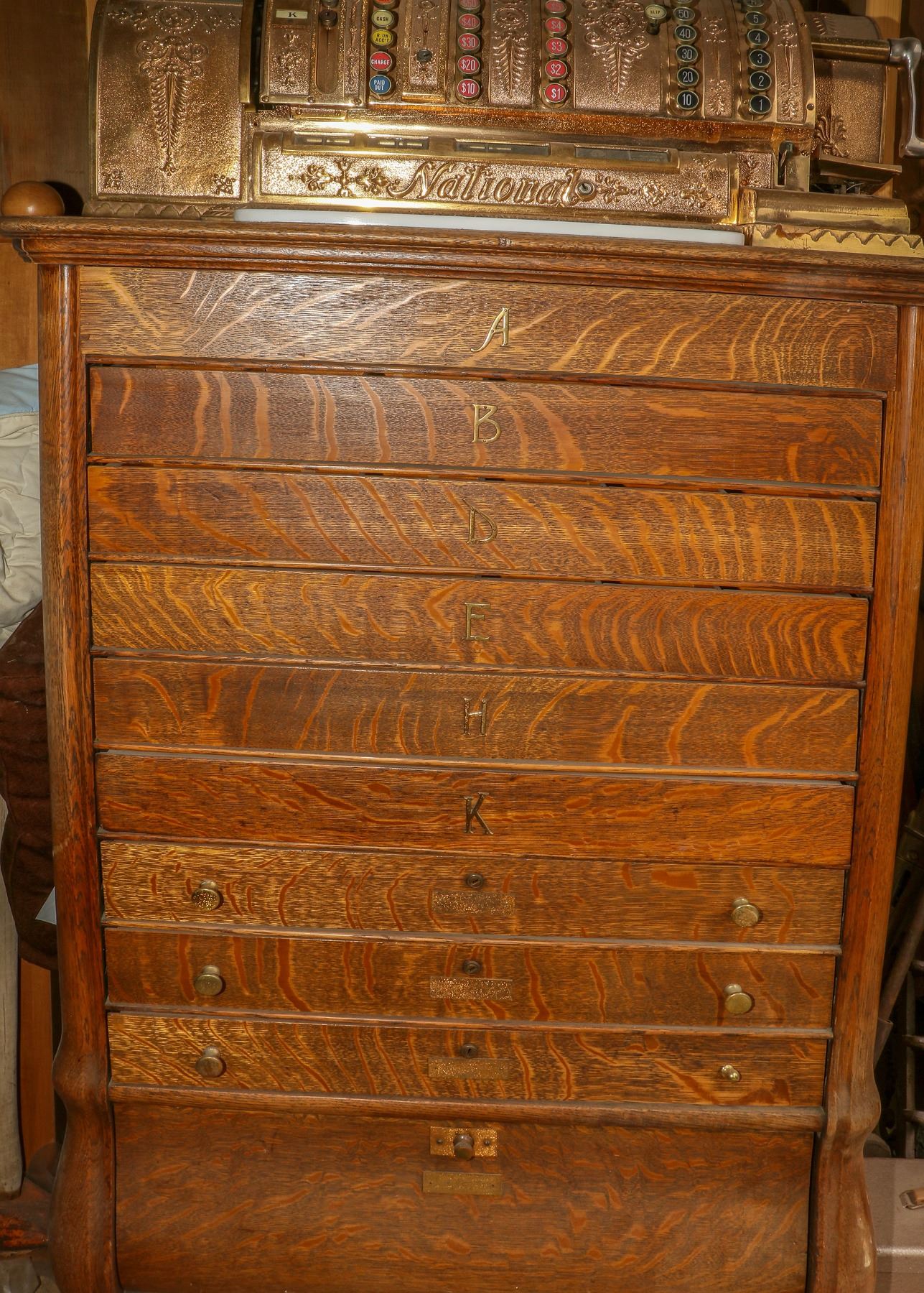 National Cash Register No: 1461464 Manufacturer Guarantee Date Nov. 25, 1914. Made by the National Cash Register Company of Dayton, Ohio. Mint condition, exquisite design and durability, typical of the first decades of the 20th century. Original mechanism and intricate details. Information on Manufacturer Guarantee in bottom of drawer. Size 562-6F. Finish: A. 9-Drawer Cash Register. Class 500. Patented 1904. Guarantee has salesman's name and inspector's name, sign by President of company John Patterson.