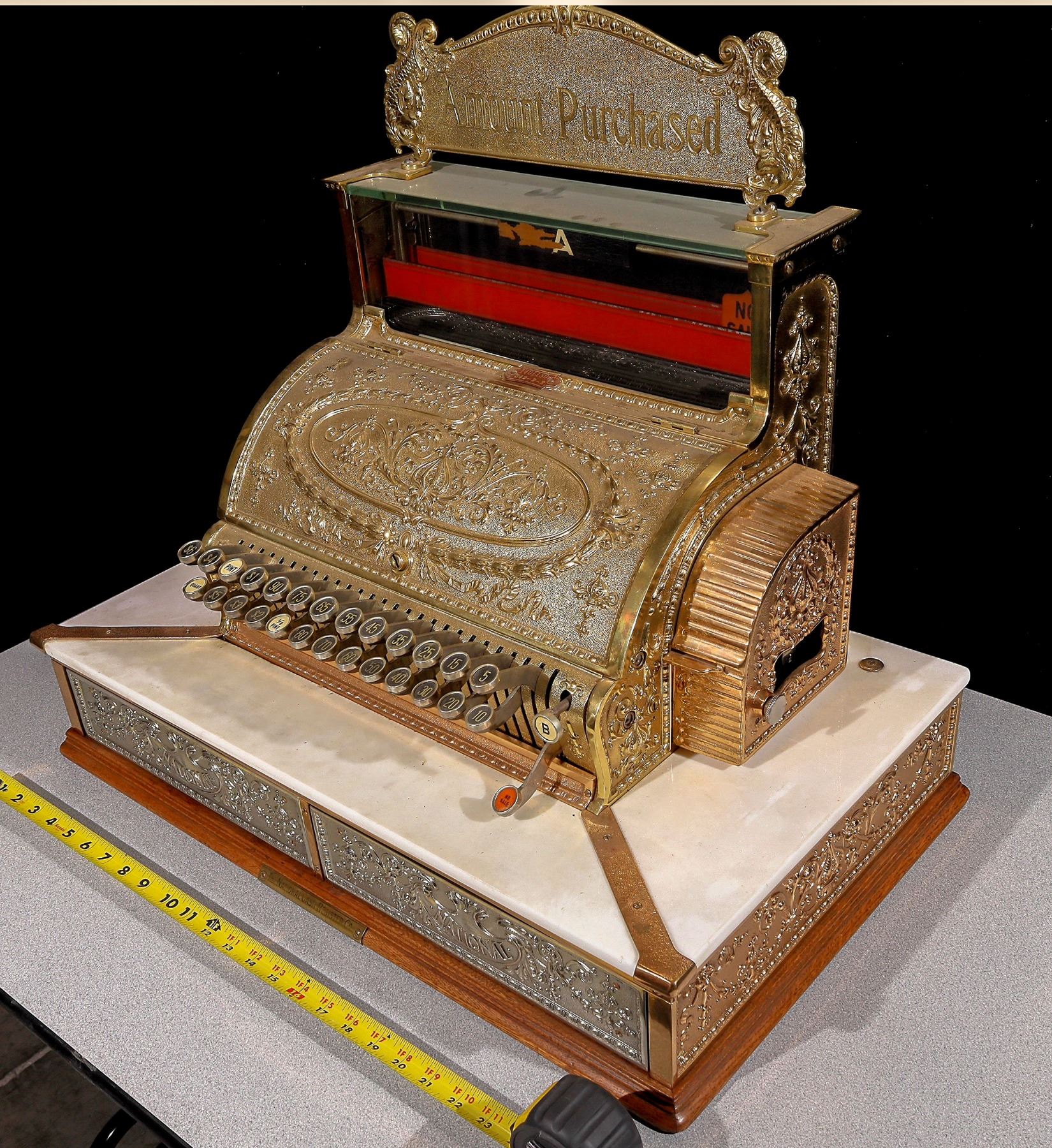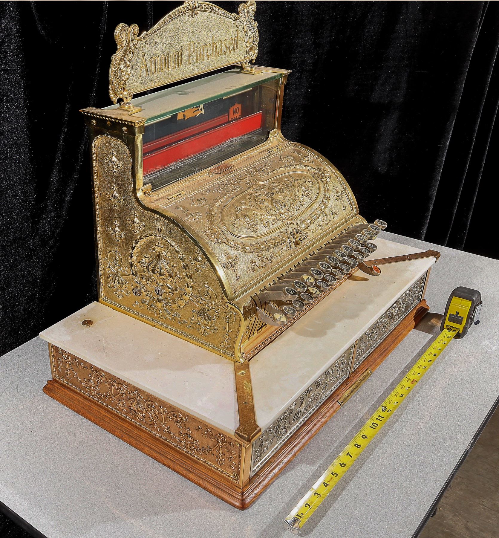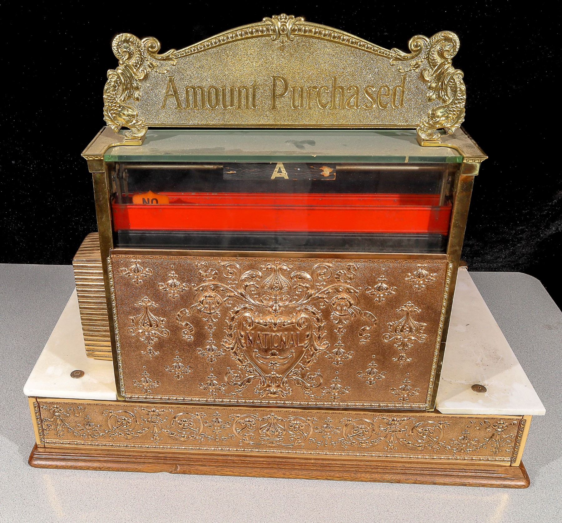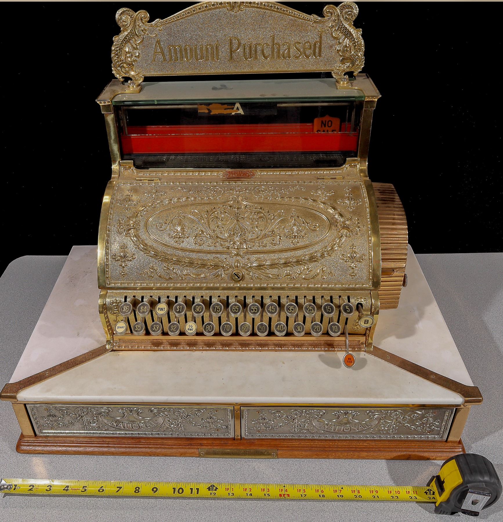 Fancy cash register in nickel and brass, made by National Cash Register. Brass sign attached at top reads // Amount Purchased //. Serial # 1401130w, 3492-2. Also includes an Ingle System white metal sign that appears to be a reproduction that comes with the register. The use of this sign would have indicated that they accepted patented (and more likely to be genuine) Ingle tokens. Two cash drawers, both embossed // National // on the front. Original sign on the base. Some of the original celluloid price key tabs are labeled for half pint, pint, and quart, indicating this cash register was used in a saloon. Appears to be fully restored. White, faux marble top that is 27 x 16 inches, and the overall size is 27 x 17 x 23 inches, c1900-10. LOCAL PICK-UP ONLY.