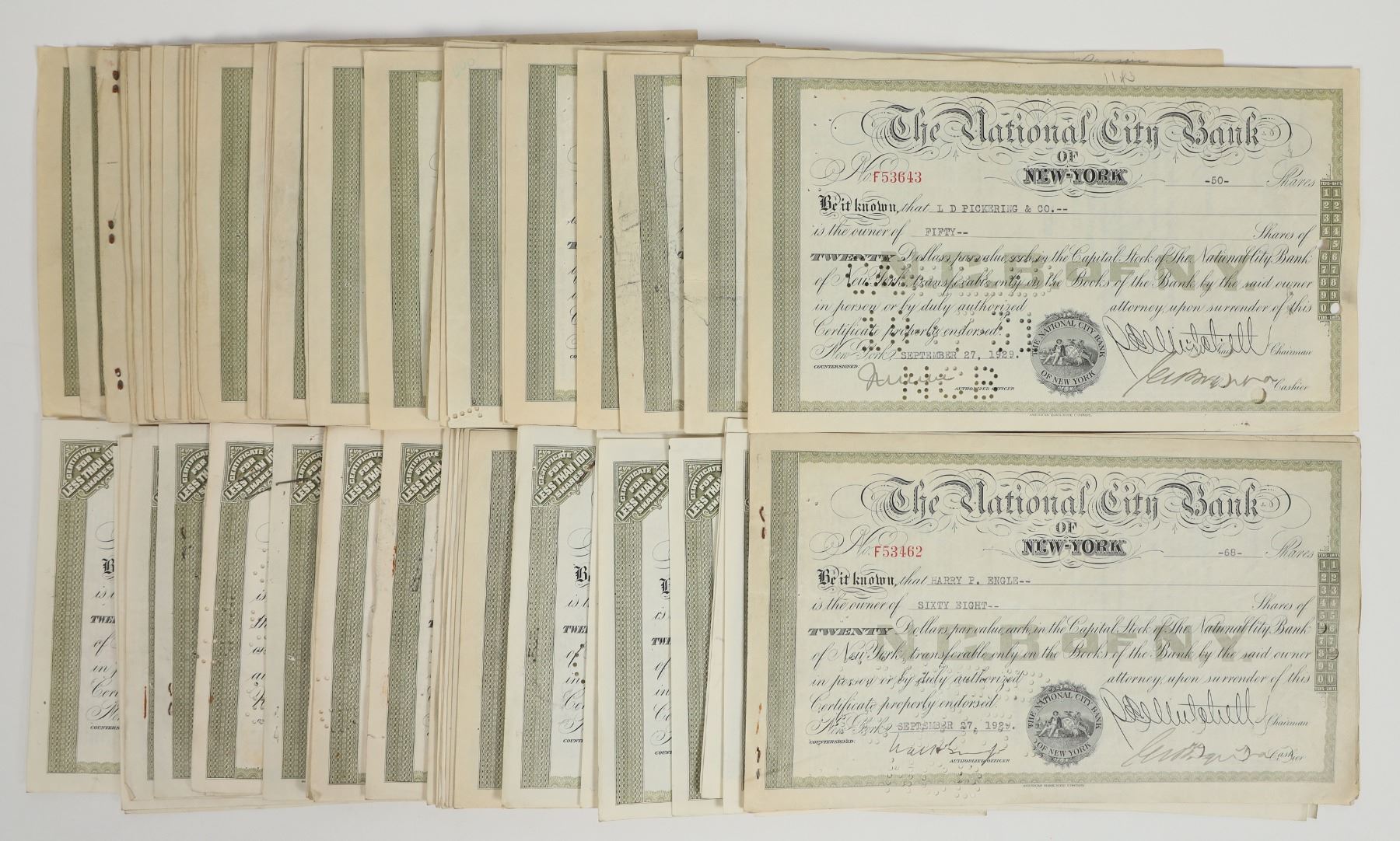 Group of approx. 120 stock certificates from the National City Bank of New York, dating from 1929 to 1955. All issued, all cancelled using hole punch cancellation. Small vignette of sailor and Native American. 9.75"x5.75" certificates. Light toning throughout lot; see photos for detail.